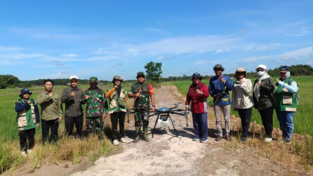 Kotawaringin Barat – Dalam rangka memperkuat ketahanan pangan, Program TNI Manunggal Membangun Desa (TMMD) Reguler Ke-128 Kodim 1014/Pangkalanbun memperkenalkan inovasi terbaru di bidang pertanian dengan penggunaan teknologi drone sprayer di Desa Berambai Makmur, Kecamatan Pangkalan Banteng, Kabupaten Kotawaringin Barat, pada Kamis (23/4/2026).