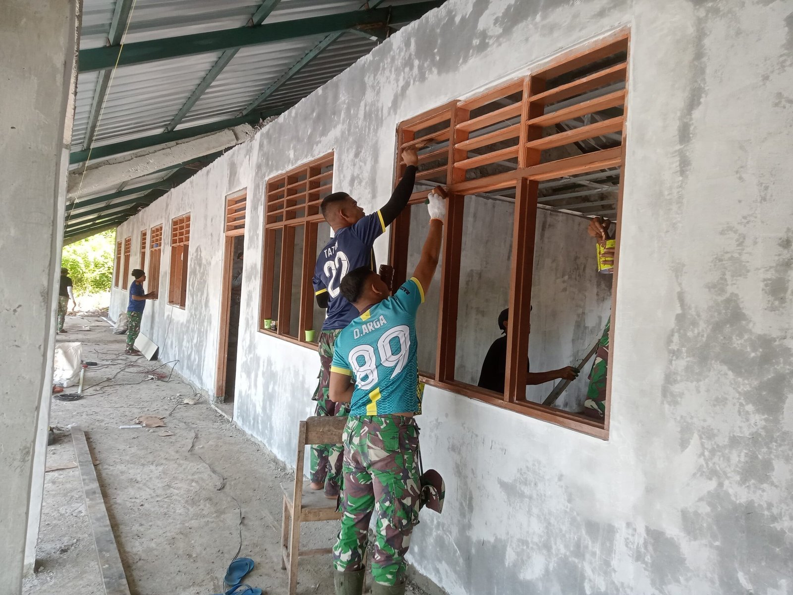 Para Personel Satgas TMMD dengan penuh ketelitian mengoleskan lapisan cat pada kusen jendela. Tak sekadar memperindah tampilan sekolah, proses pengecatan ini juga bertujuan melindungi kayu dari kerusakan akibat cuaca dan rayap, sehingga bangunan lebih tahan lama dan nyaman bagi para siswa.