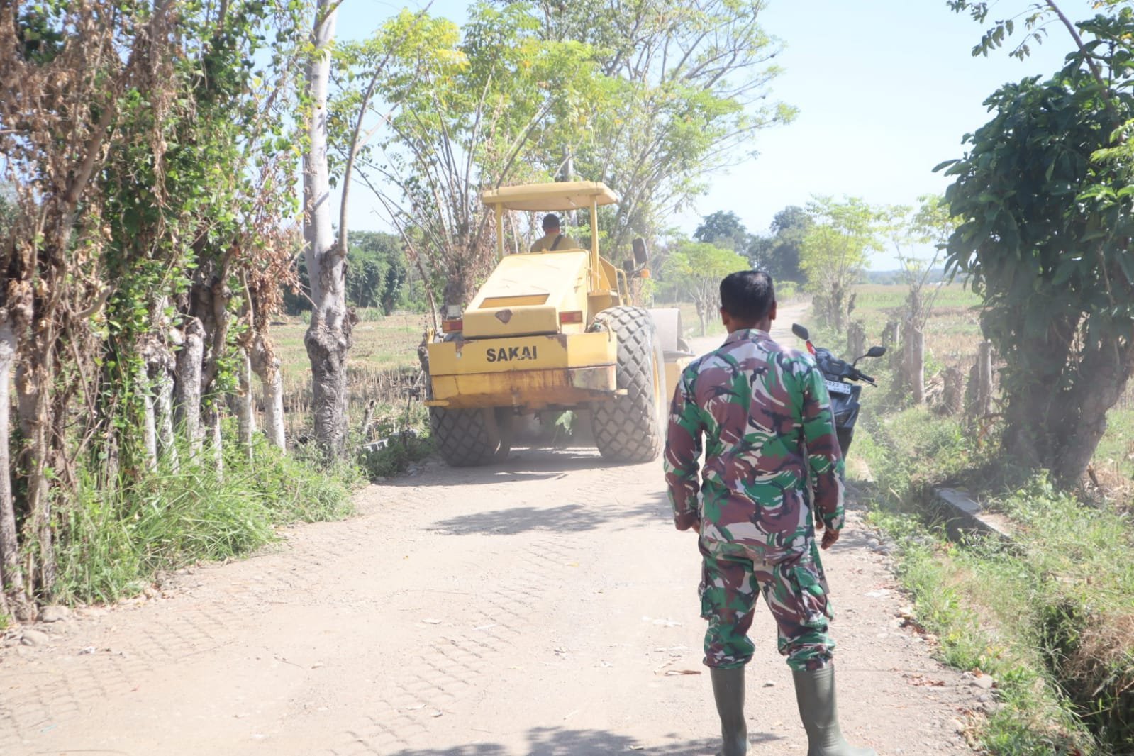 Pengerjaan menggunakan road roller SAKAI ini ditujukan untuk menciptakan permukaan jalan yang rata dan kuat, sehingga memudahkan petani dalam mengangkut hasil panen. Akses yang baik juga akan meminimalkan risiko kerusakan kendaraan akibat jalan bergelombang.