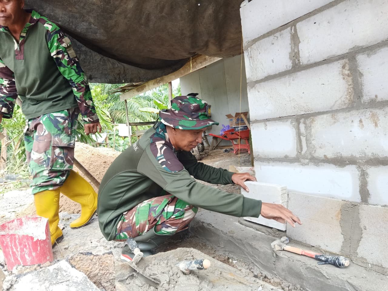 Dengan penuh ketelitian, Pelda Gatot menata bata ringan satu per satu sambil memastikan setiap lapisan sejajar sempurna. Sementara warga membantu menyiapkan bahan bangunan dan adukan semen. Suasana kerja tampak akrab dan penuh canda, menggambarkan semangat gotong royong yang menjadi ciri khas TMMD.