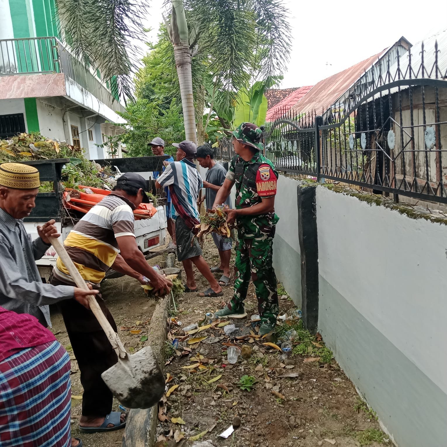 Nampak puluhan warga dibantu Babinsa melaksanakan pembersihan halaman masjid dari sampah – sampah di lingkungan sekitar masjid tersebut kemudian dibuang ke tempat pembakaran sampah.