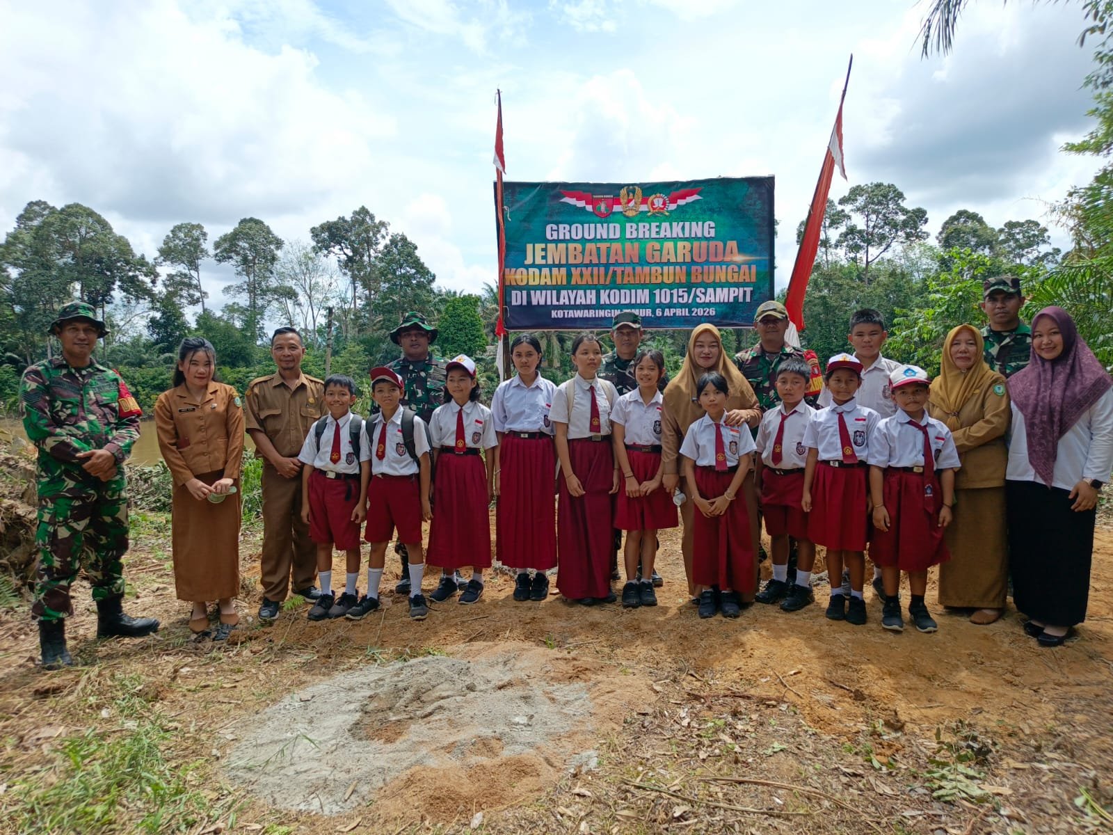 Kotawaringin Timur – Pembangunan dua Jembatan Garuda di wilayah Kodim 1015/Sampit resmi dimulai. Prosesi ground breaking yang menjadi tanda awal proyek ini dilaksanakan oleh Komando Distrik Militer (Kodim) 1015/Sampit. Kegiatan berlangsung pada Jumat, 10 April 2026, di Dusun Tandang, Kecamatan Parenggean, Kabupaten Kotim, di mana personil TNI bersama masyarakat setempat bersiap untuk mendorong bahan-bahan yang diperlukan dalam pembangunan.