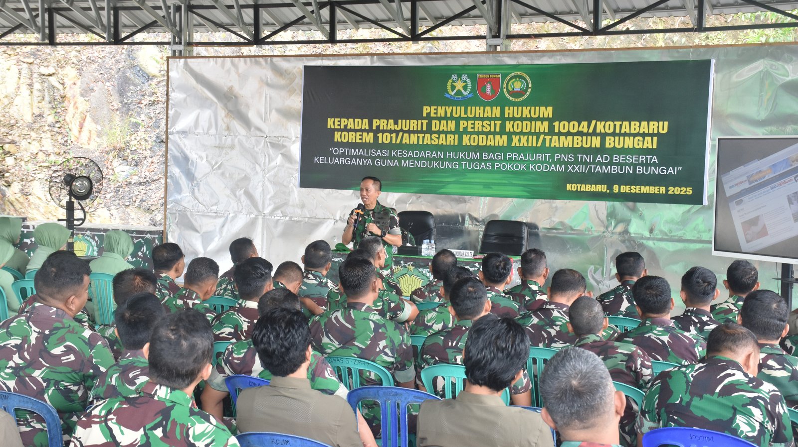 KOTABARU – Kodim 1004/Kotabaru menggelar kegiatan penyuluhan hukum yang diikuti oleh para prajurit serta anggota Persit Kartika Chandra Kirana Cabang XXVII Dim 1004. Kegiatan ini dilaksanakan sebagai upaya preventif untuk meningkatkan kedisiplinan, pemahaman hukum, serta kesadaran akan pentingnya taat aturan dalam kehidupan kedinasan maupun keluarga.