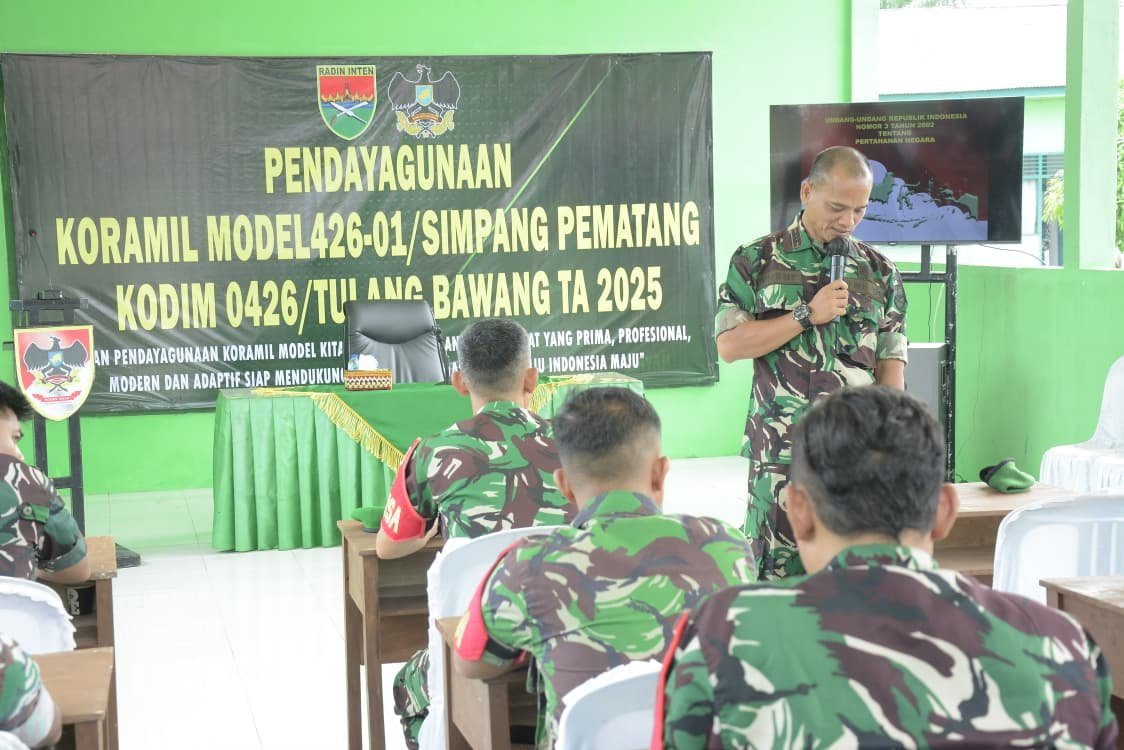 Simpang Pematang, (Mesuji) — Danramil 426-04/Banjar Agung, Kapten Inf M. Yusuf, memberikan materi wawasan hukum bagi prajurit dalam kegiatan Pemberdayaan Koramil Model Tahun 2025 yang berlangsung di Koramil 426-01/Simpang Pematang, Kecamatan Simpang Pematang, Kabupaten Mesuji, pada Rabu 12 November 2025.
