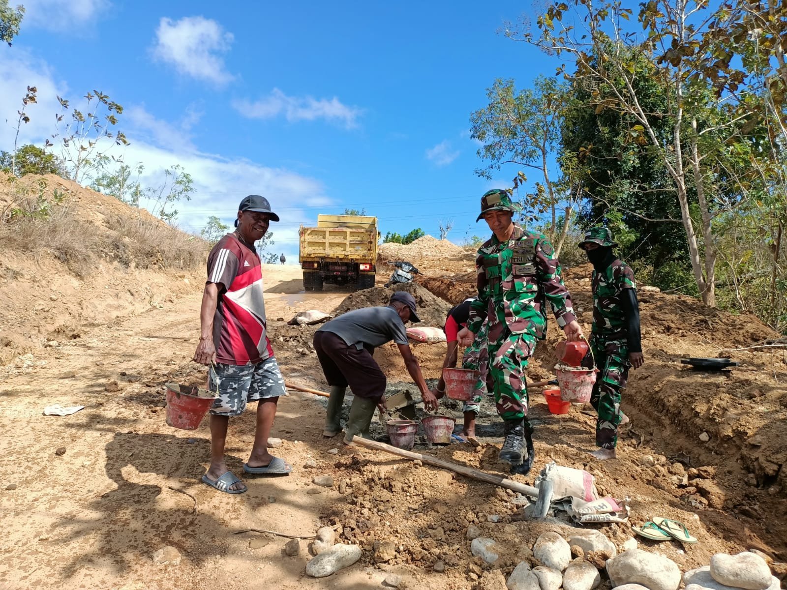 BELU, Senin (29/7/2025) — Kepala Staf Kodim (Kasdim) 1605/Belu, Mayor Kav Yatman, memimpin langsung pengerjaan tembok penahan jalan dalam program TNI Manunggal Membangun Desa (TMMD) ke-125 yang berlangsung di Desa Naekasa, Kecamatan Tasifeto Barat, Kabupaten Belu.