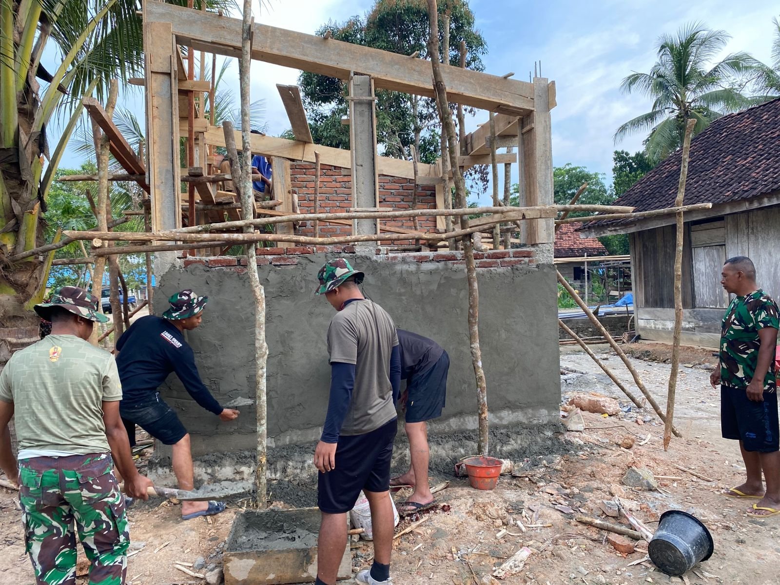 Pengerjaan plesteran merupakan tahapan penting dalam proses pembangunan karena berfungsi memperkuat struktur dinding dan mempersiapkan permukaan agar rapi sebelum dicat dan dipasang perlengkapan lainnya. Anggota Satgas TMMD bekerja dengan penuh ketelitian, memastikan adonan semen memiliki komposisi yang sesuai, serta ketebalan dan kekuatan plester terpenuhi.