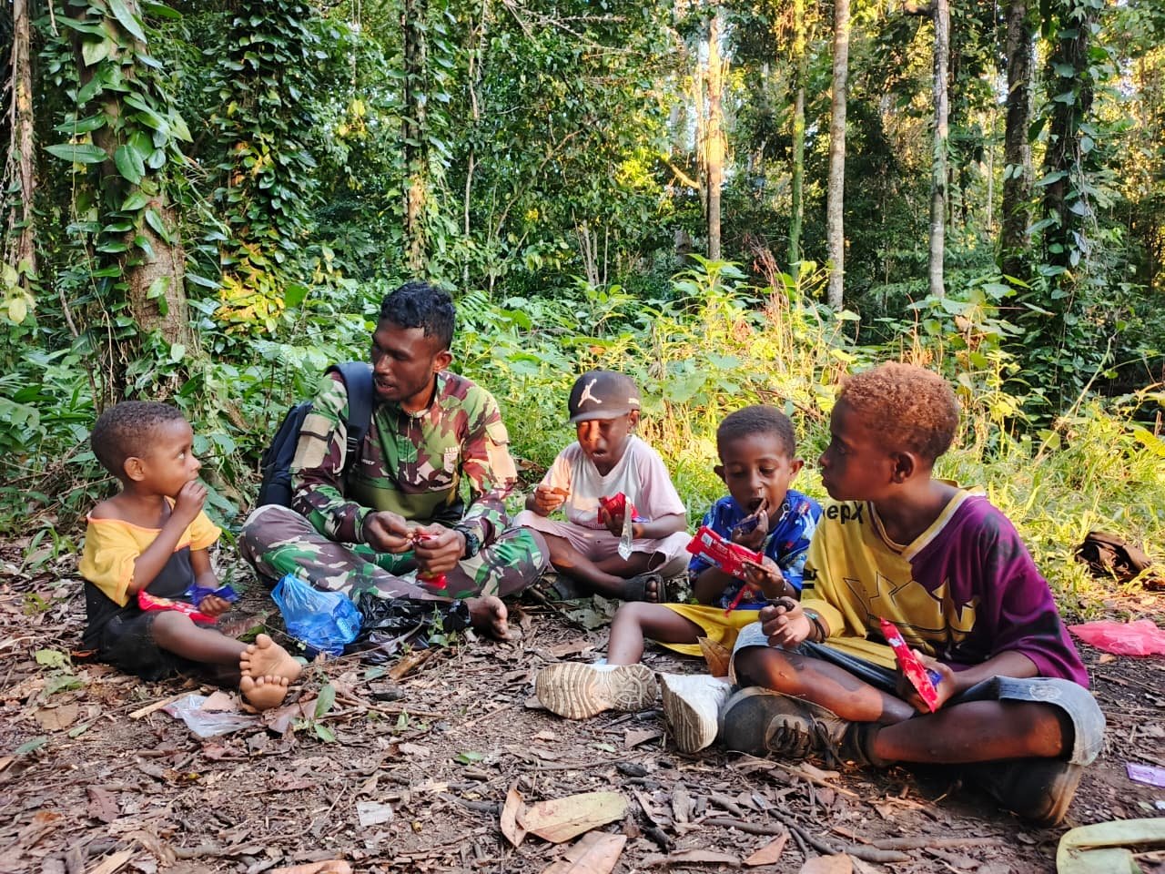 Manokwari Utara — Dalam rangka menjalankan program TMMD ke-128, Satgas Kodim 1801/Manokwari mengutamakan pendekatan humanis dengan masyarakat setempat, terutama anak-anak di Kampung Tanah Rubuh. Salah satu bentuk kegiatan tersebut adalah pembagian makanan ringan yang ditujukan untuk anak-anak, yang diharapkan dapat memberikan kehangatan bagi interaksi sosial tersebut.