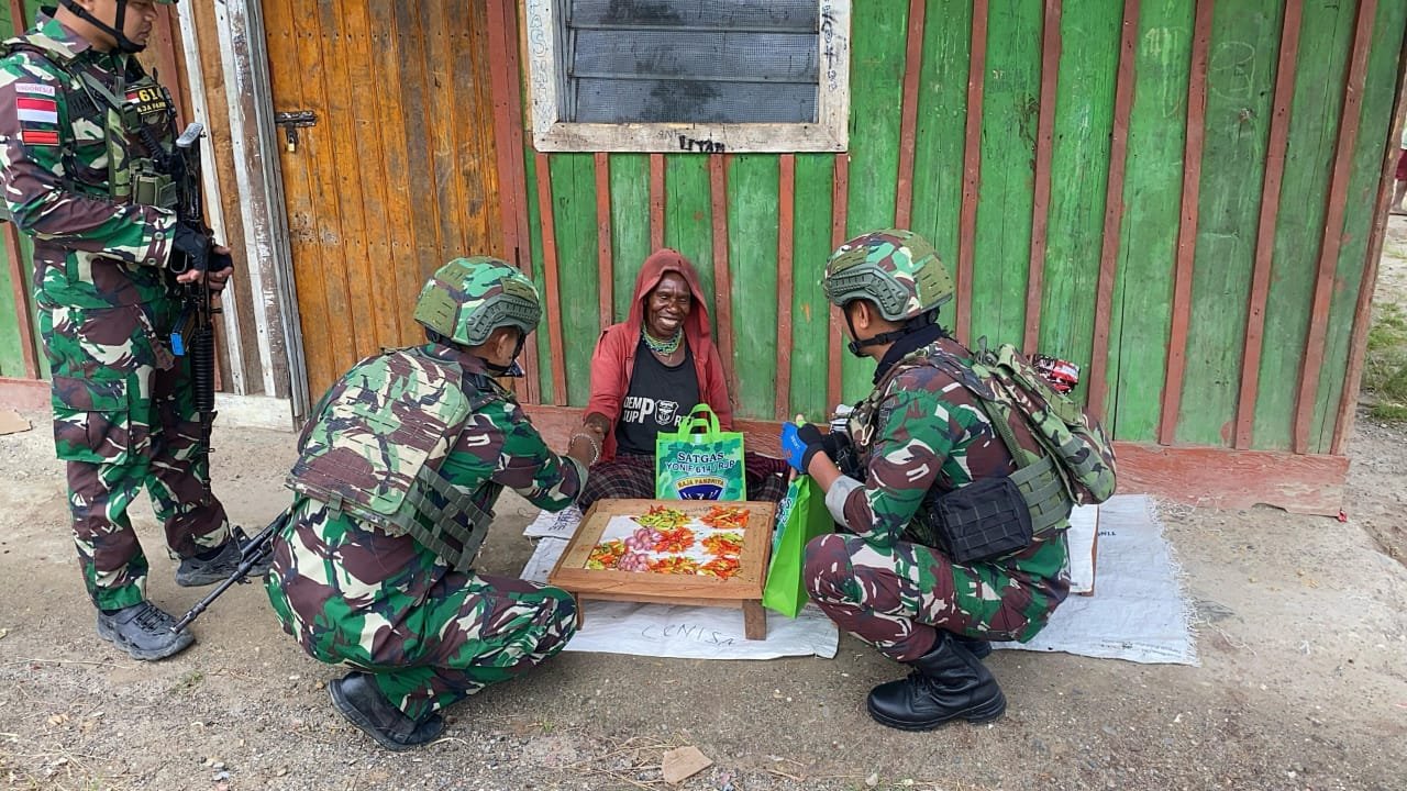 LANNY JAYA – Satgas Yonif 614/RJP Pos Malagai Pembinaan Teritorial (Binter) dengan membagikan sembako kepada masyarakat binaan yang bertempat di Kampung Numbokawi, Distrik Malagai, Kabupaten Lanny Jaya, Papua Pegunungan, Selasa (11/3/2025).