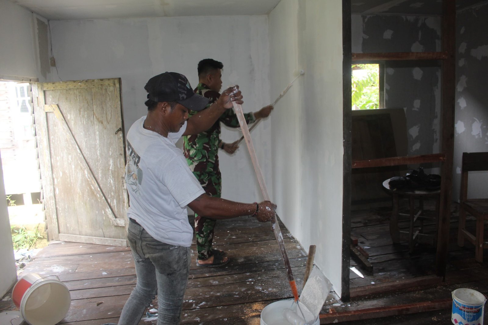 Proses pembangunan telah memasuki tahap pengecatan dinding, Terlihat warga dan personil Satgas bahu membahu mengerjakan salah satu sasaran fisik RTLH, mempercepat proses pembangunan agar rumah segera bisa dihuni