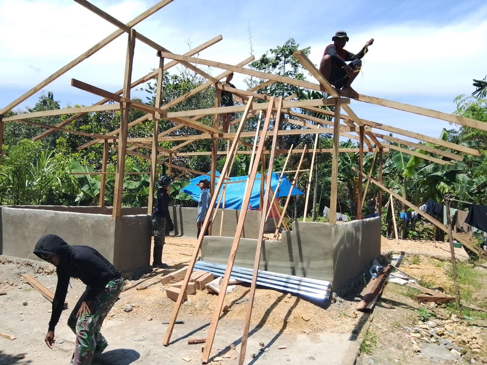 Prajurit TNI terlihat bekerja sama dengan masyarakat dalam berbagai tahapan pembangunan, dimulai dari pemasangan rangka kayu bagian atas hingga proses perapian atau pemeluran lantai bangunan.