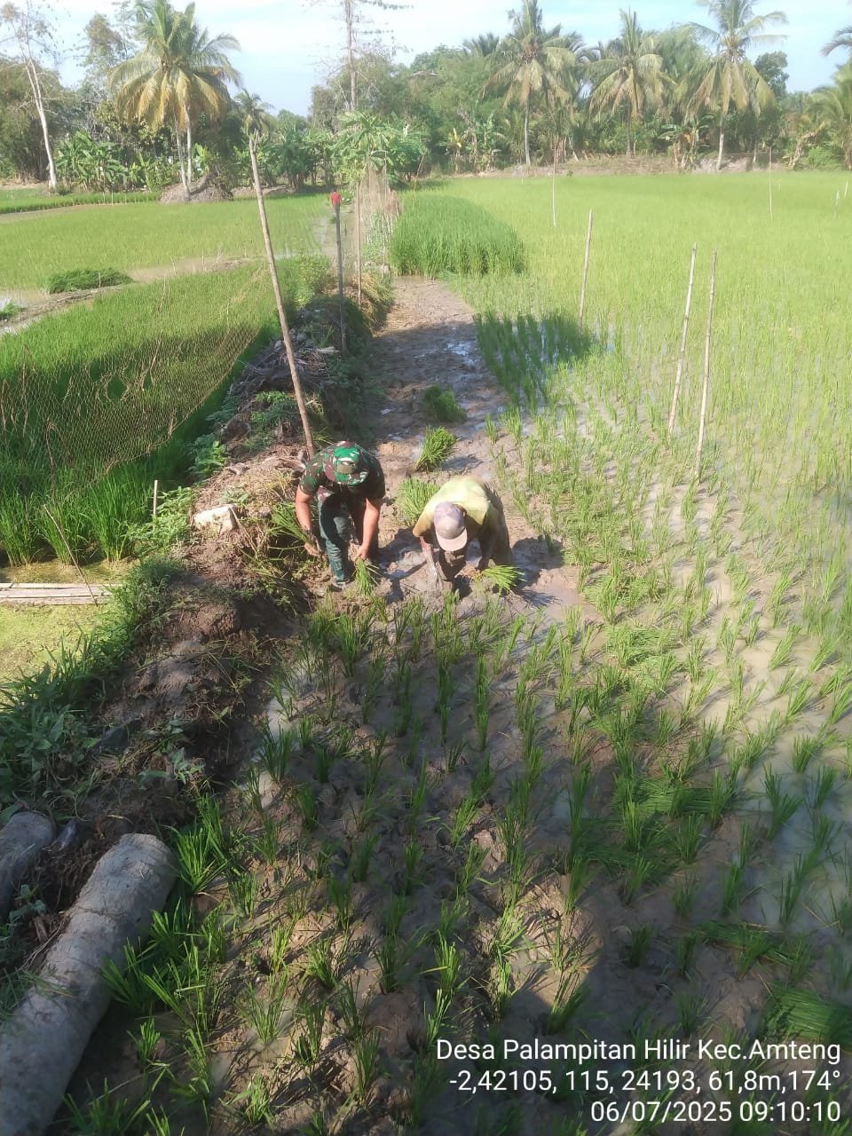 HULU SUNGAI UTARA – Babinsa Koramil 1001-07/Amuntai Utara Kodim 1001/HSU-BLG, Sertu Syamsudin, turun langsung ke sawah membantu petani desa binaannya menanam padi di areal persawahan Desa Pelampitan Hilir, Kecamatan Amuntai Tengah, Kabupaten Hulu Sungai Utara, Minggu (6/7/2025).