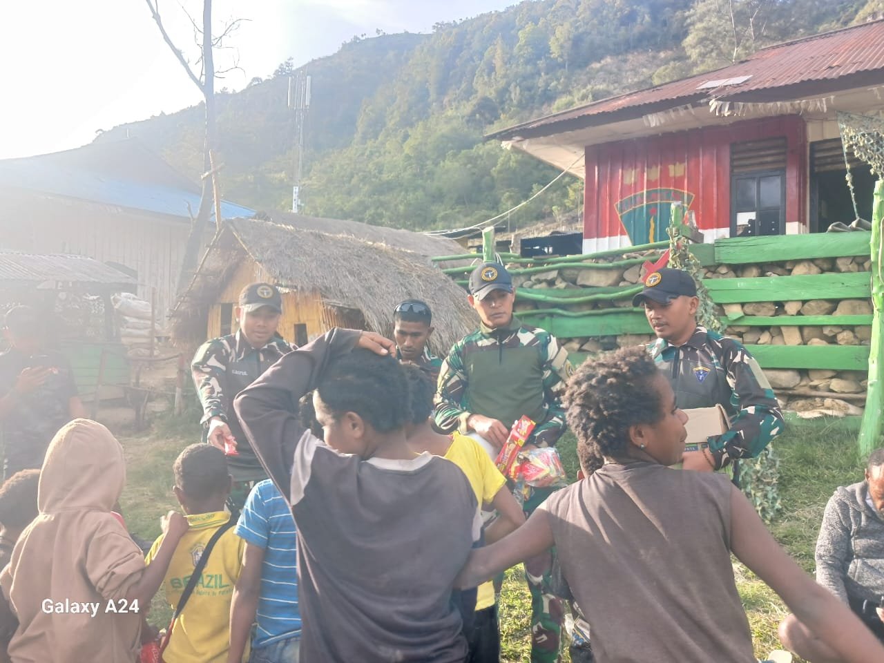 LANNY JAYA – Wujud perhatian dan cinta kasih terhadap anak-anak di perbatasan papua, Satgas Yonif 614/RJP Pos Balingga bagikan snack dan jajanan yang bertempat di Desa Balingga, Distrik Balingga, Kabupaten Lanny Jaya, Papua Pegunungan.