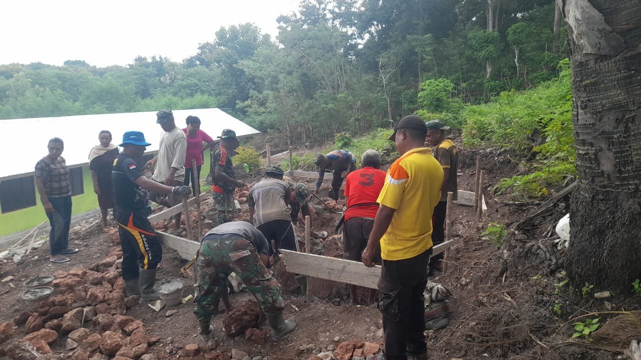 NTT-KEFAMENANU., Tidak ada kata lelah dalam kamus Satgas TMMD ke-123 Kodim 1618/TTU dan masyarakat Desa Lanaus. Sejak pagi, mereka sudah sibuk mengangkat ember berisi semen untuk menyelesaikan pembangunan bak air di SDN Lanaus.