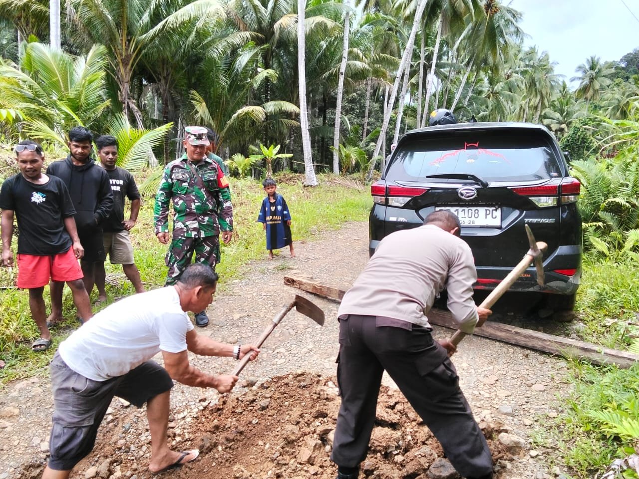 Kerja Bhakti Babinsa, Bhabinkamtibmas, dan Masyarakat Perbaiki Jalan Rusak