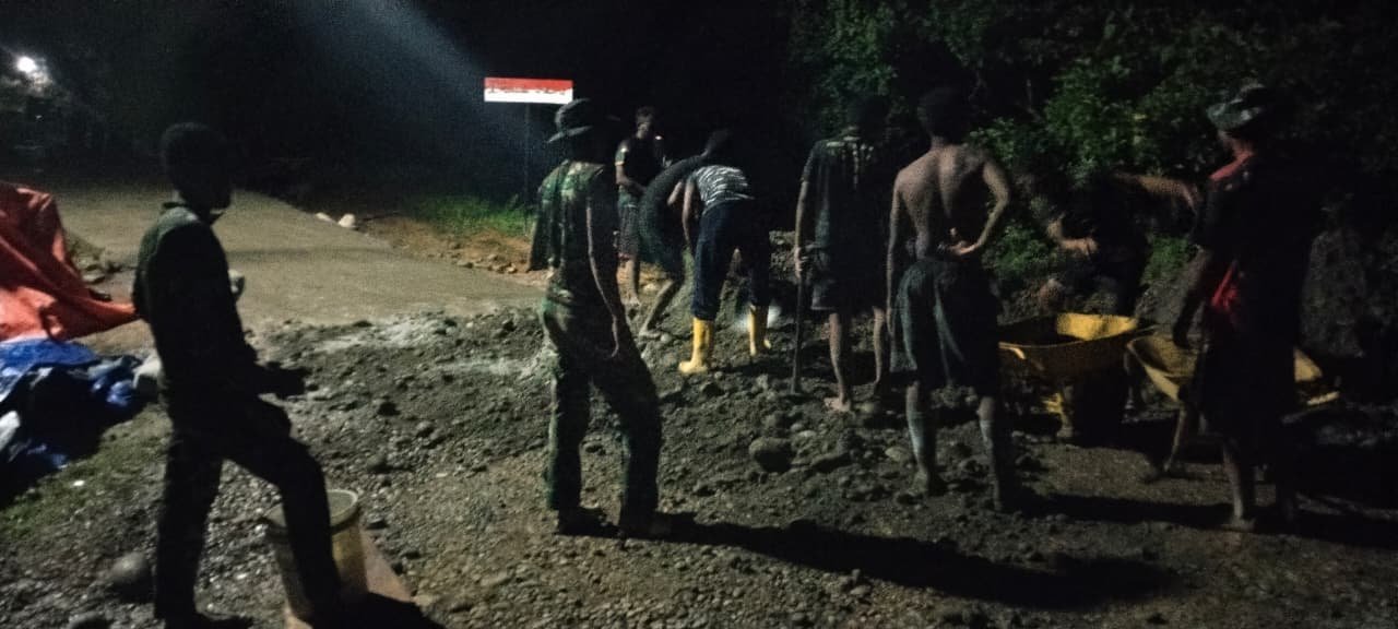 Di lokasi pembangunan, para personel TNI bersama warga terus bekerja meski cahaya lampu penerangan sederhana menjadi satu-satunya sumber cahaya. Suasana penuh kebersamaan tampak dari cara mereka bergantian mengangkut material, mencampur adonan semen, hingga memadatkan permukaan jalan beton.