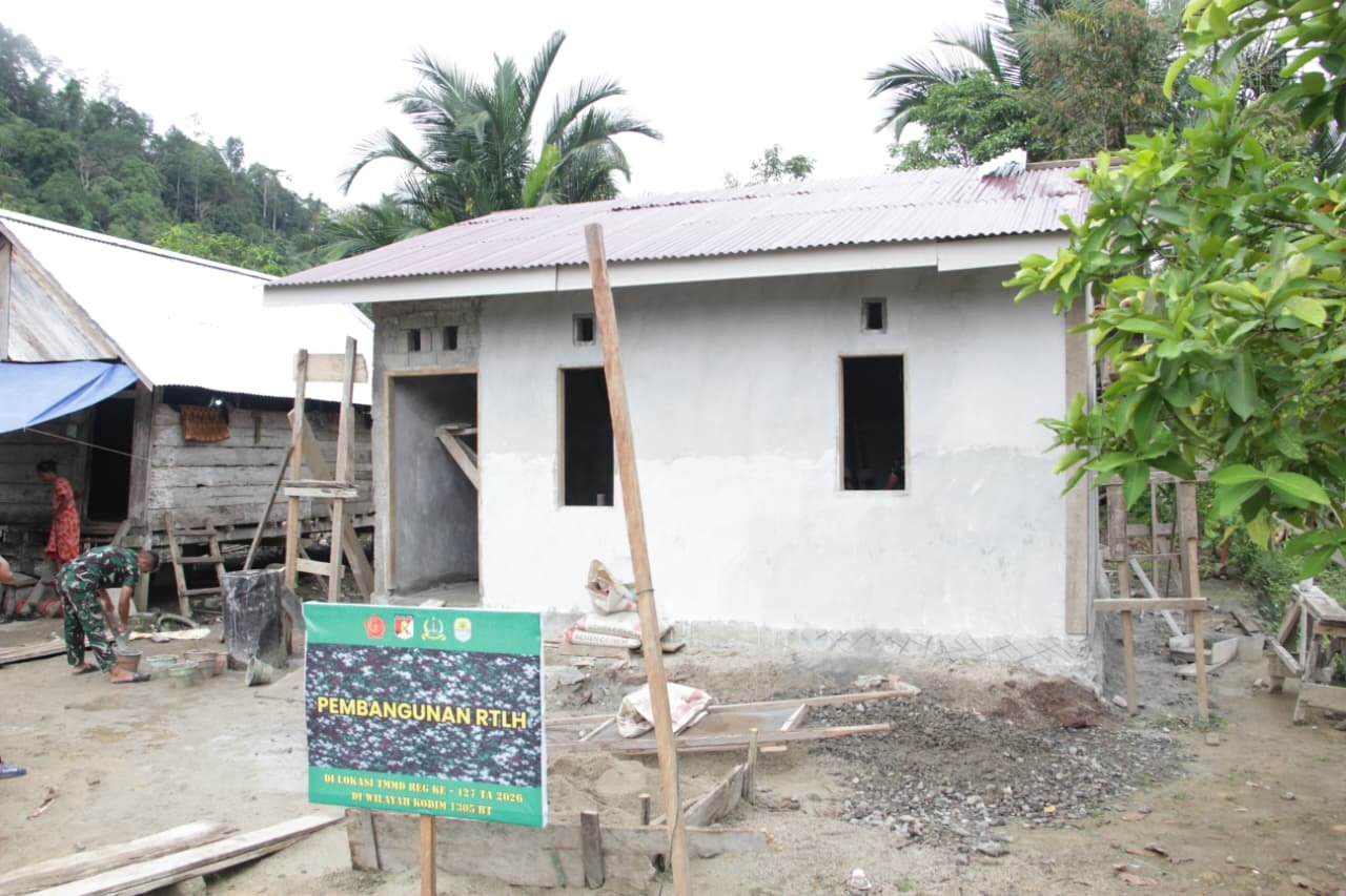 Tolitoli – Pembangunan Rumah Tidak Layak Huni (RTLH) dalam rangka program TNI Manunggal Membangun Desa (TMMD) ke-127 terus berlangsung di Dusun Ogomolobu, Desa Oyom, Kecamatan Lampasio, Kabupaten Tolitoli, pada Sabtu (21/2/2026). Satgas TMMD dari Kodim 1305/Buol Tolitoli bersama warga setempat berkolaborasi secara aktif dalam pelaksanaan berbagai tahapan pekerjaan, mulai dari penyusunan bata, pengecoran lantai, hingga pemasangan rangka atap.
