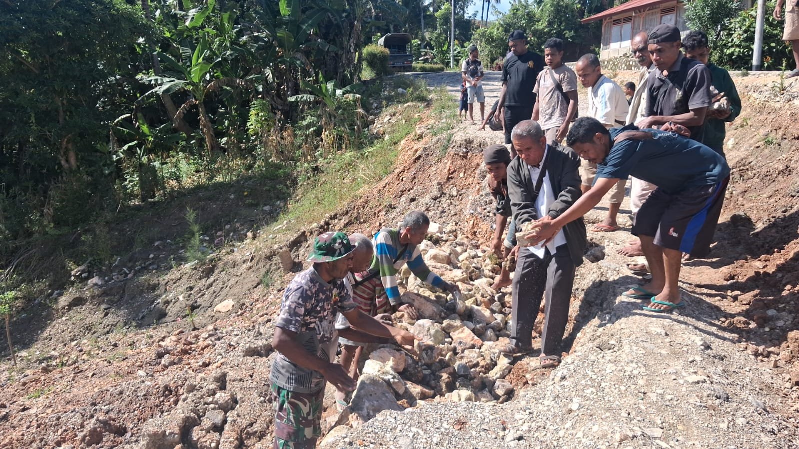 Adanya kerusakan tersebut mengakibatkan terhambatnya akses transportasi baik untuk kendaraan roda dua maupun roda empat, yang sangat berdampak terhadap aktivitas masyarakat sekitar. Menyikapi hal tersebut, anggota TNI bersama pihak terkait lainnya segera berinisiatif turun ke lokasi untuk melaksanakan gotong royong bersama warga setempat.