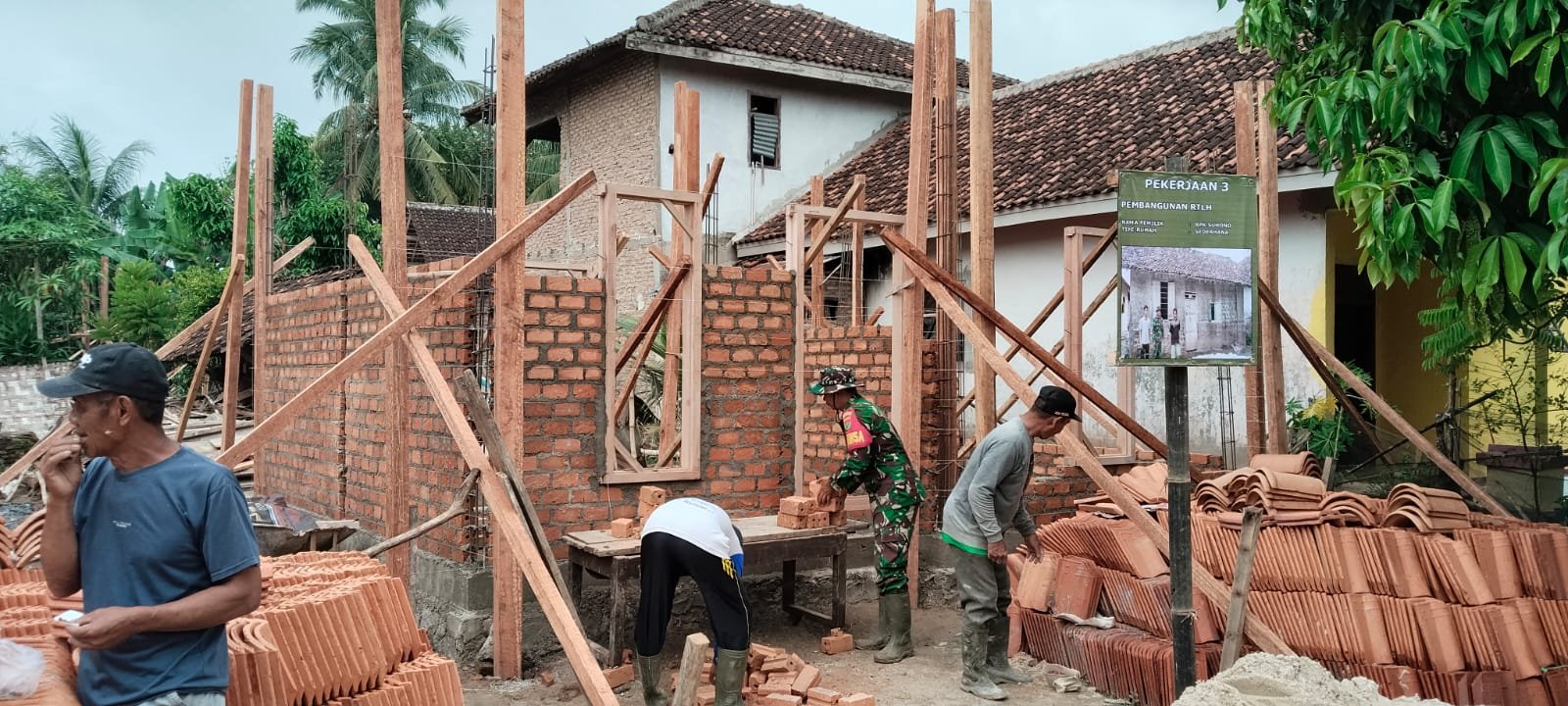 Pesawaran, Provinsi Lampung – Ibu Siti Hamdiah, seorang penerima manfaat program RTLH (Rumah Tidak Layak Huni) di Desa Tanjung Rejo, mengungkapkan kekagumannya terhadap kinerja Satgas TMMD ke-127 Kodim 0421/LS. Pada hari ketiga pelaksanaan, proses pemasangan batu bata keliling rumahnya telah mencapai hampir 2 meter, dan saat ini sedang dilakukan pemasangan kusen.