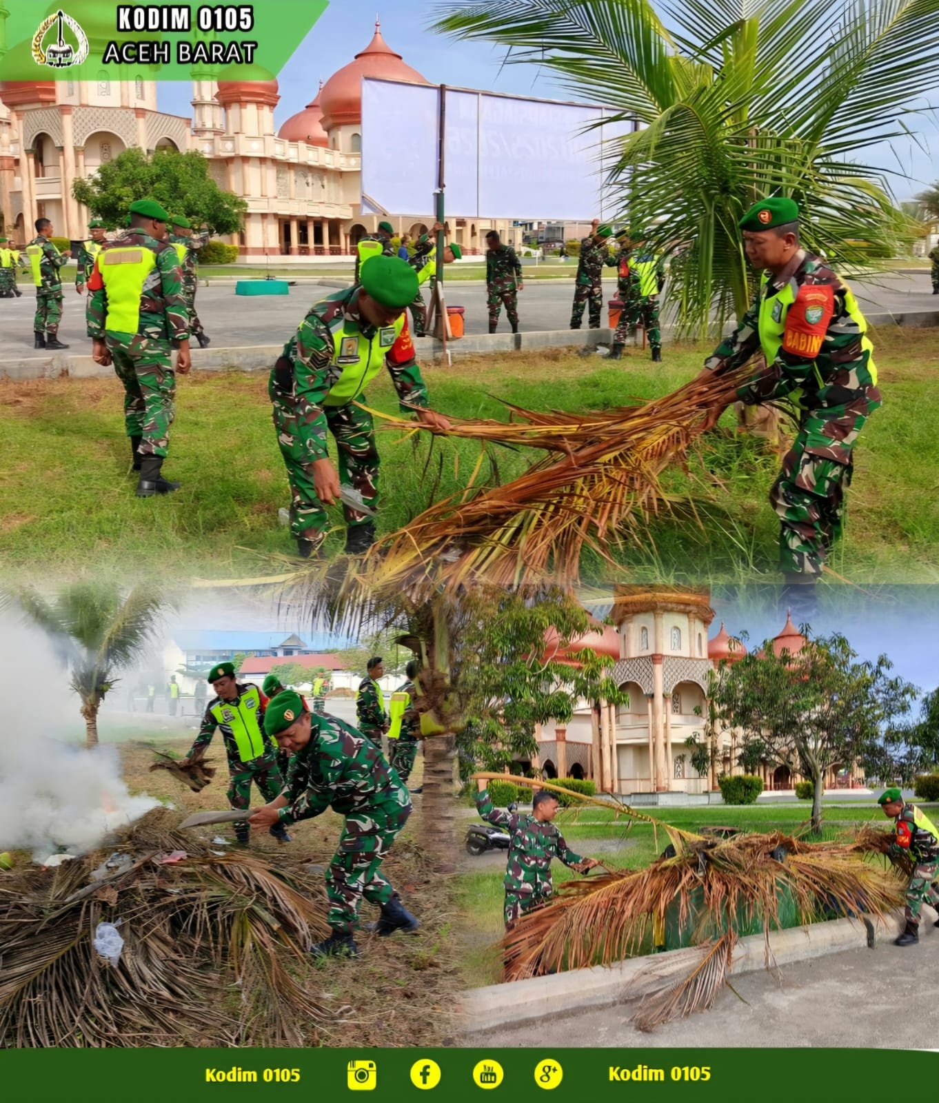 ACEH BARAT – Dalam rangka menyambut datangnya Tahun Baru 2026 Masehi, prajurit Kodim 0105/Abar menggelar aksi sosial gotong royong membersihkan lingkungan Masjid Agung Baitul Makmur, Jalan Imam Bonjol, Desa Seuneubok, Kecamatan Johan Pahlawan, Selasa (30/12/2025).