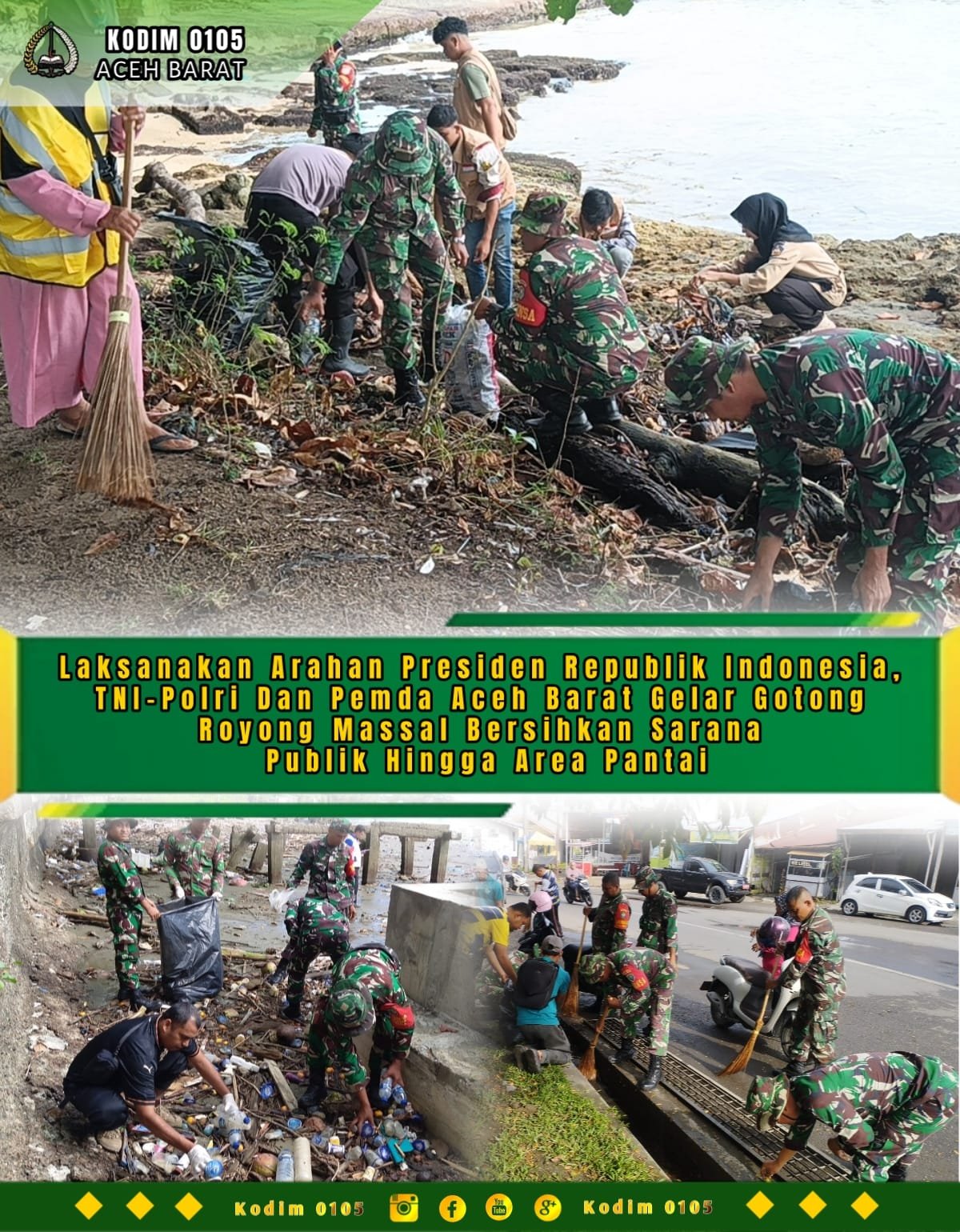 Dandim 0105/Aceh Barat, Letkol Inf S. Kembaren, S.E., M.I.P., CFrA., menyampaikan bahwa gotong royong massal ini merupakan respons cepat atas arahan Presiden Republik Indonesia untuk memperkuat kolaborasi dan sinergi dalam membersihkan sampah, khususnya di sarana publik dan tempat wisata.