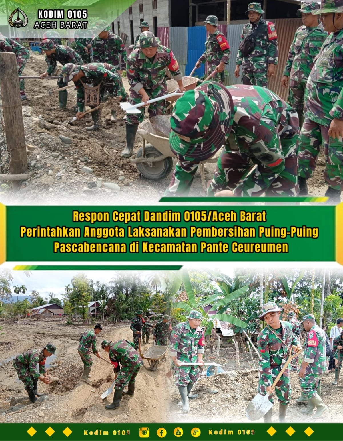 ACEH BARAT – Komando Distrik Militer (Kodim) 0105/Aceh Barat kembali menunjukkan peran aktif dan kepeduliannya terhadap masyarakat dalam menghadapi situasi darurat akibat bencana alam. Menyikapi bencana yang melanda sejumlah wilayah di Kecamatan Pante Ceureumen, Selasa (06/01/2026).