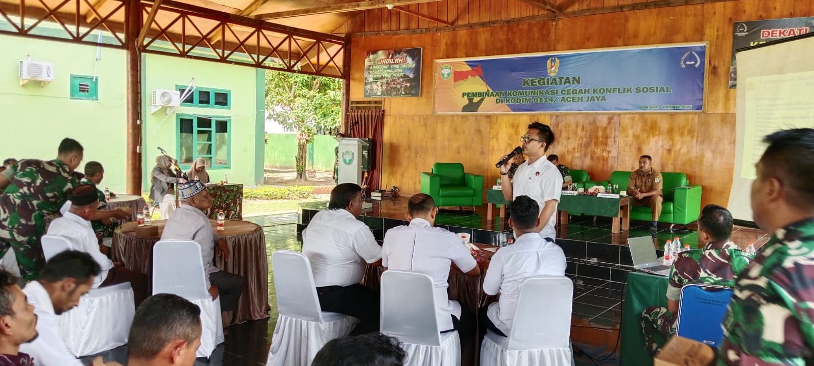 Dalam sambutannya, Dandim 0114/Aceh Jaya Letkol Czi Aris Wudiatmoko, S.I.P. menyampaikan bahwa kegiatan ini merupakan langkah strategis untuk memperkuat sinergi antara aparat dan masyarakat dalam mencegah terjadinya konflik sosial. Ia menekankan pentingnya komunikasi yang efektif dan terbuka dalam menjaga kerukunan serta mendorong terciptanya suasana damai di tengah masyarakat.