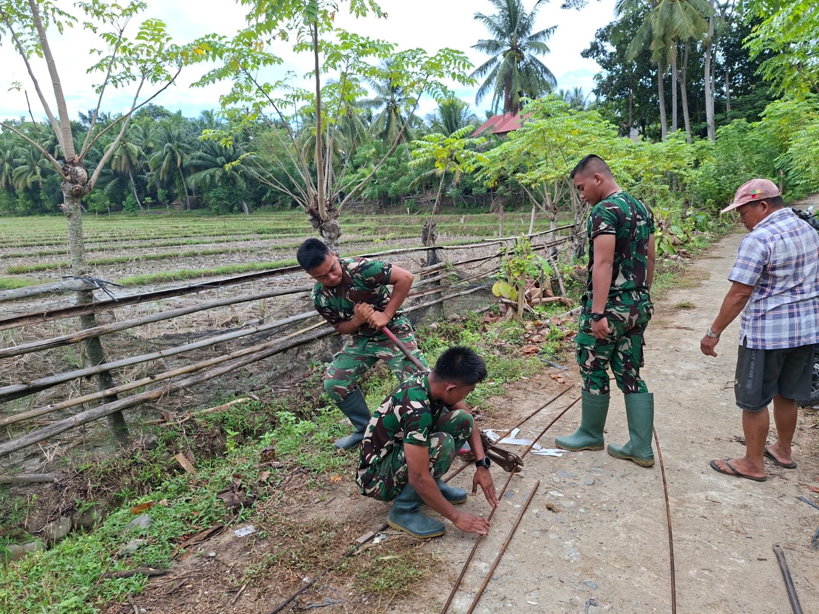 Lokasi pembangunan yang tengah berlangsung di Desa Cahaya Batin menunjukkan semangat gotong royong yang tinggi, di mana Satgas Jembatan Perintis Garuda Kodim 0408/BS dan masyarakat lokal secara kompak melaksanakan tugas teknis seperti pengukuran, pemotongan, dan perakitan besi sebagai tulangan untuk pengecoran, demi mempercepat kemajuan proyek.