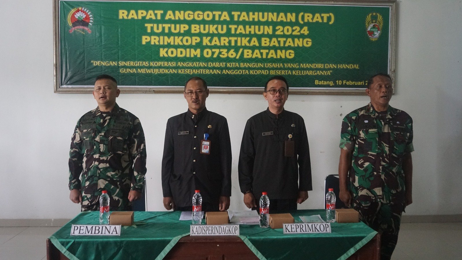 Kegiatan Rapat Anggota Tahunan (RAT) dipimpin langsung oleh Dandim 0736/Batang Letkol Inf Ahmad Alam Budiman selaku Pembina Koperasi Kartika A-10 Batang. Tampak hadir dalam rapat tersebut Kadisperindagkop Kabupaten Batang Wahyu Budi Santoso dan Kepala Primer Koperasi A-10 Batang Kapten Cpm Joko Wahyono.