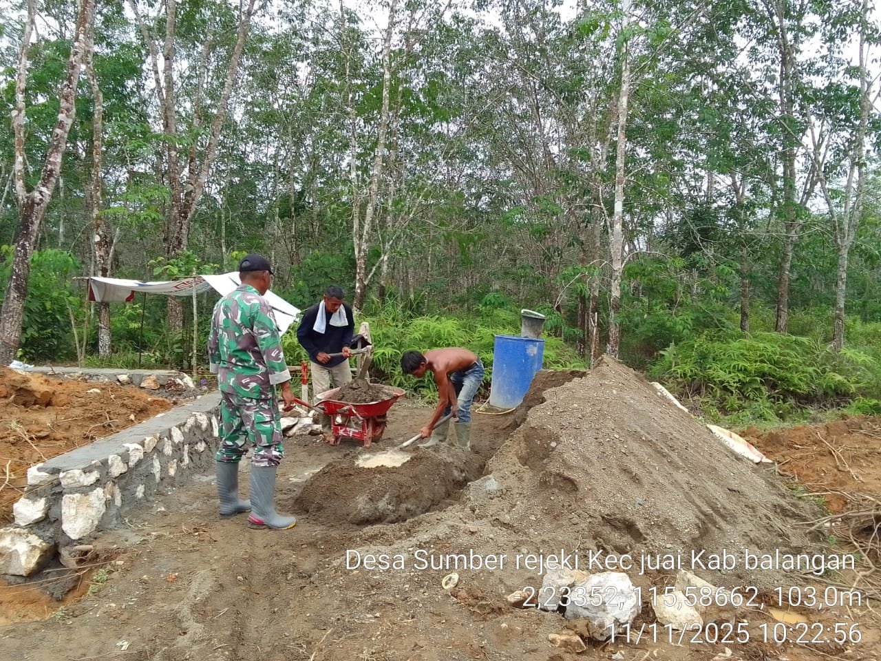 Balangan – Pembangunan Koperasi Desa Kreatif Mandiri Produktif (KDKMP) di wilayah Kodim 1001/HSU-BLG terus menunjukkan progres positif. Kegiatan pembangunan di titik KDKMP Desa Sumber Rejeki, Kecamatan Juai, Kabupaten Balangan kembali dilanjutkan dengan pekerjaan pemasangan batu pondasi. Pada hari Selasa (11/11/2025)