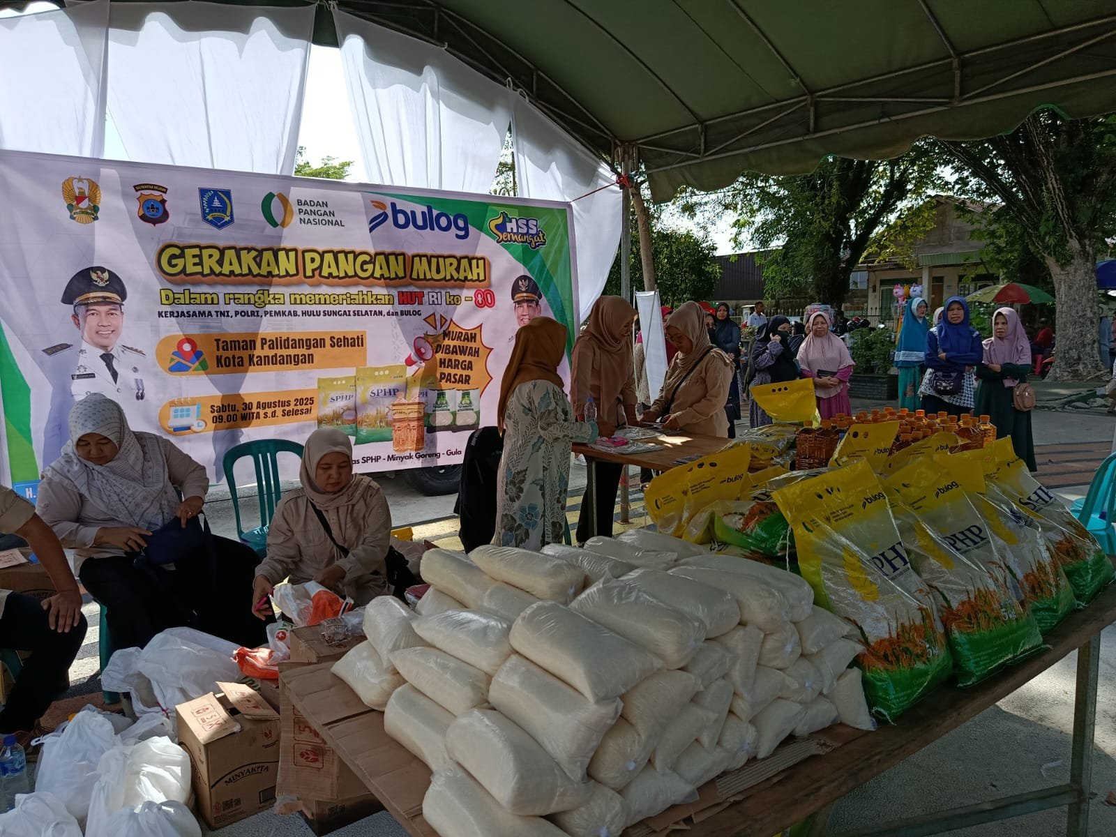 HULU SUNGAI SELATAN – Masih dalam momen bulan peringatan Hari Kemerdekaan Republik Indonesia (RI) Ke 80, prajurit Kodim 1003/Hulu Sungai Selatan (HSS) bersinergi dan berkolaborasi bersama pemerintah daerah Kabupaten HSS dan Polri (Polres HSS) menggelar Gerakan Pangan Murah (GPM) sebagai upaya wujudkan kehadiran pemerintah untuk masyarakat dalam mengendalikan inflansi serta menyakinkan ketersedian bahan pangan yang murah tersedia. Sabtu (30/8/25)
