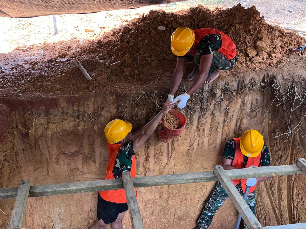 Dengan semangat gotong royong, para prajurit TNI melaksanakan penggalian lubang pondasi cakar ayam yang menjadi dasar utama bagi konstruksi jembatan. Cuaca yang terik tidak mematahkan tekad mereka untuk menyelesaikan proyek ini tepat waktu.