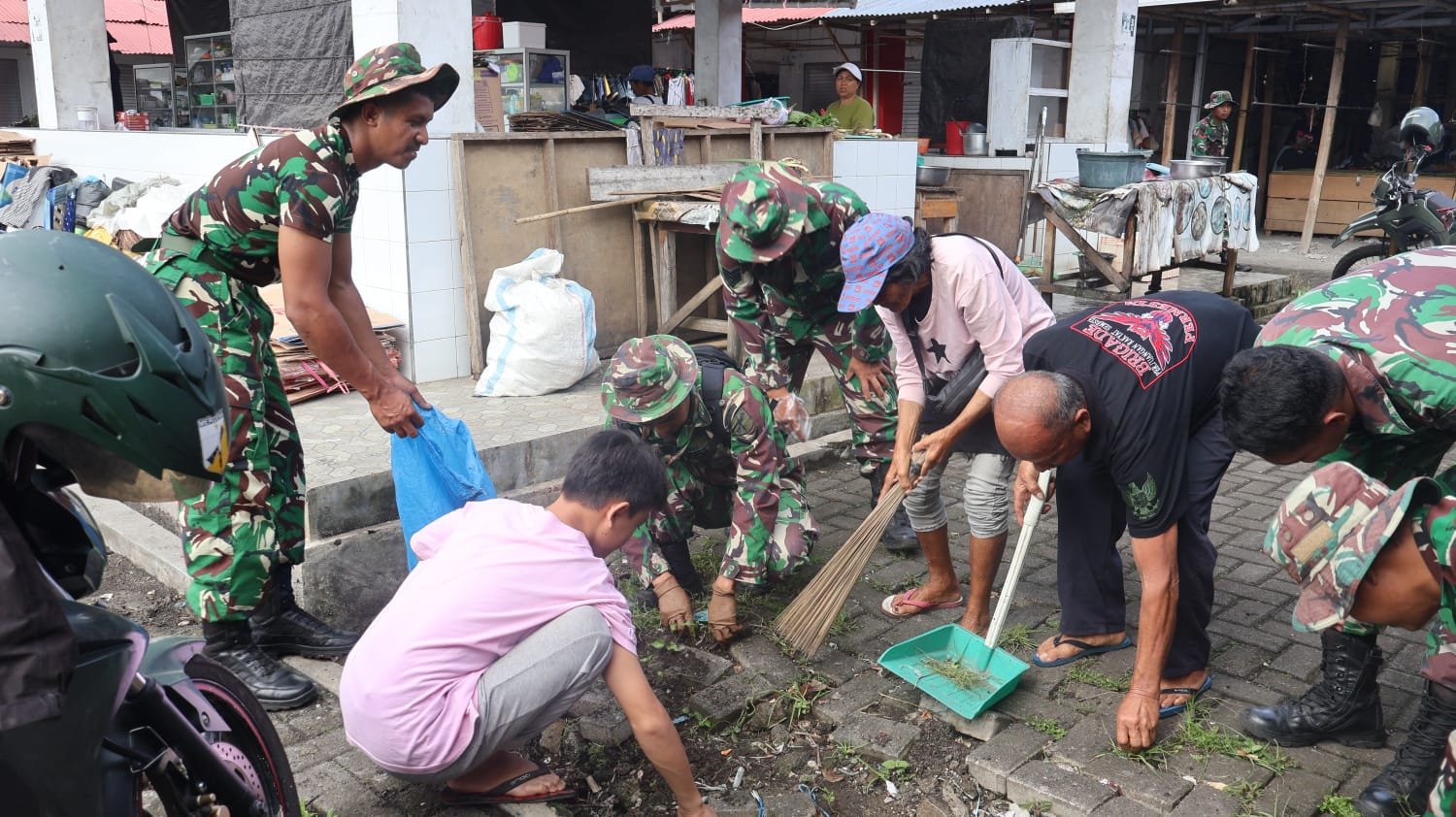 Di Amurang, Kabupaten Minahasa Selatan, kegiatan dilaksanakan di Pasar 54 Amurang, Kelurahan Uwuran I, dengan dihadiri sekitar 30 peserta. Dipimpin oleh Danramil 1302-14/Amurang Lettu Inf Jantje Marten Wulur, kegiatan diawali dengan apel dan doa, sebelum dilanjutkan dengan pembersihan area pasar dalam suasana yang penuh kebersamaan.