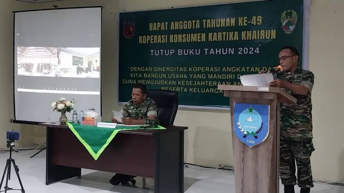 Kodim 1501/Ternate, Ternate – Kodim 1501/Ternate menggelar Rapat Anggota Tahunan (RAT) ke-49 Koperasi Konsumen Kartika Khairun tutup buku tahun 2024 di Aula Kantor Camat Ternate Utara, Kota Ternate. Jumat (25/4/2025).