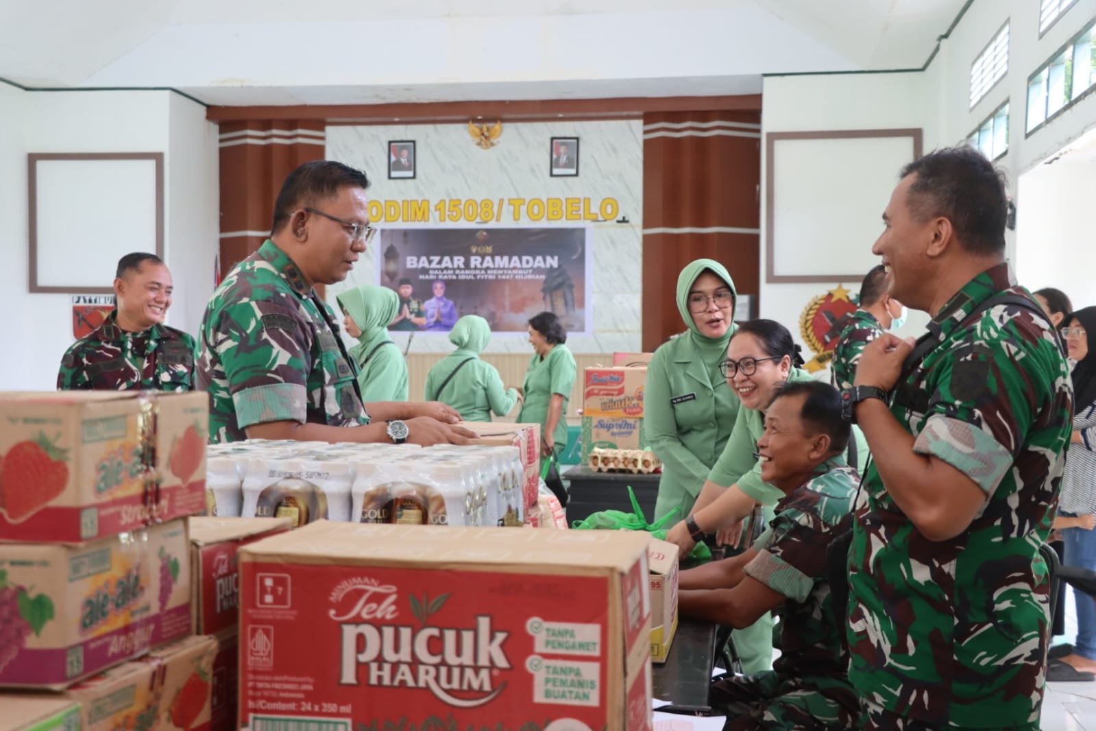 Halmahera Utara – Dalam rangka menyambut Hari Raya Idul Fitri 1447 Hijriah, Kodim 1508/Tobelo melaksanakan Bazar Ramadan di Aula Makodim 1508/Tobelo, yang terletak di Jalan Ir. Hein Namotemo, Desa MKCM, Kecamatan Tobelo, Kabupaten Halmahera Utara, pada Selasa (17/03/2026). Kegiatan ini dipimpin oleh Dandim 1508/Tobelo, Letkol Inf Alex Donald M.L. Gaol, S.E., M.M., dan dihadiri oleh Ketua Persit KCK Cabang XXXI Kodim 1508/Tobelo, Ny. Indri Alex, bersama para Perwira Staf, Danramil, personel Kodim, anggota Persit, serta masyarakat setempat. Dandim 1508/Tobelo menjelaskan bahwa Bazar Ramadan ini merupakan bentuk perhatian Kodim terhadap prajurit dan masyarakat dalam memenuhi kebutuhan pokok menjelang Idul Fitri. “Kegiatan ini bertujuan untuk membantu meringankan beban masyarakat serta memperkuat ikatan antara TNI dan rakyat,” ungkapnya. Ia menambahkan bahwa kegiatan ini adalah wujud nyata dari pembinaan teritorial yang menjadi salah satu fungsi utama satuan kewilayahan. Bazar Ramadan menarik antusiasme baik dari personel maupun warga yang hadir, dengan berbagai kebutuhan pokok tersedia dengan harga terjangkau. Kegiatan ini diharapkan dapat memperkuat sinergi antara TNI dan masyarakat serta menegaskan peran TNI sebagai solusi dalam menghadapi kesulitan rakyat. Kodim 1508/Tobelo berkomitmen untuk terus melaksanakan kegiatan teritorial yang adaptif, profesional, dan humanis demi mendukung tugas pokok TNI AD serta menjaga stabilitas dan ketahanan wilayah.