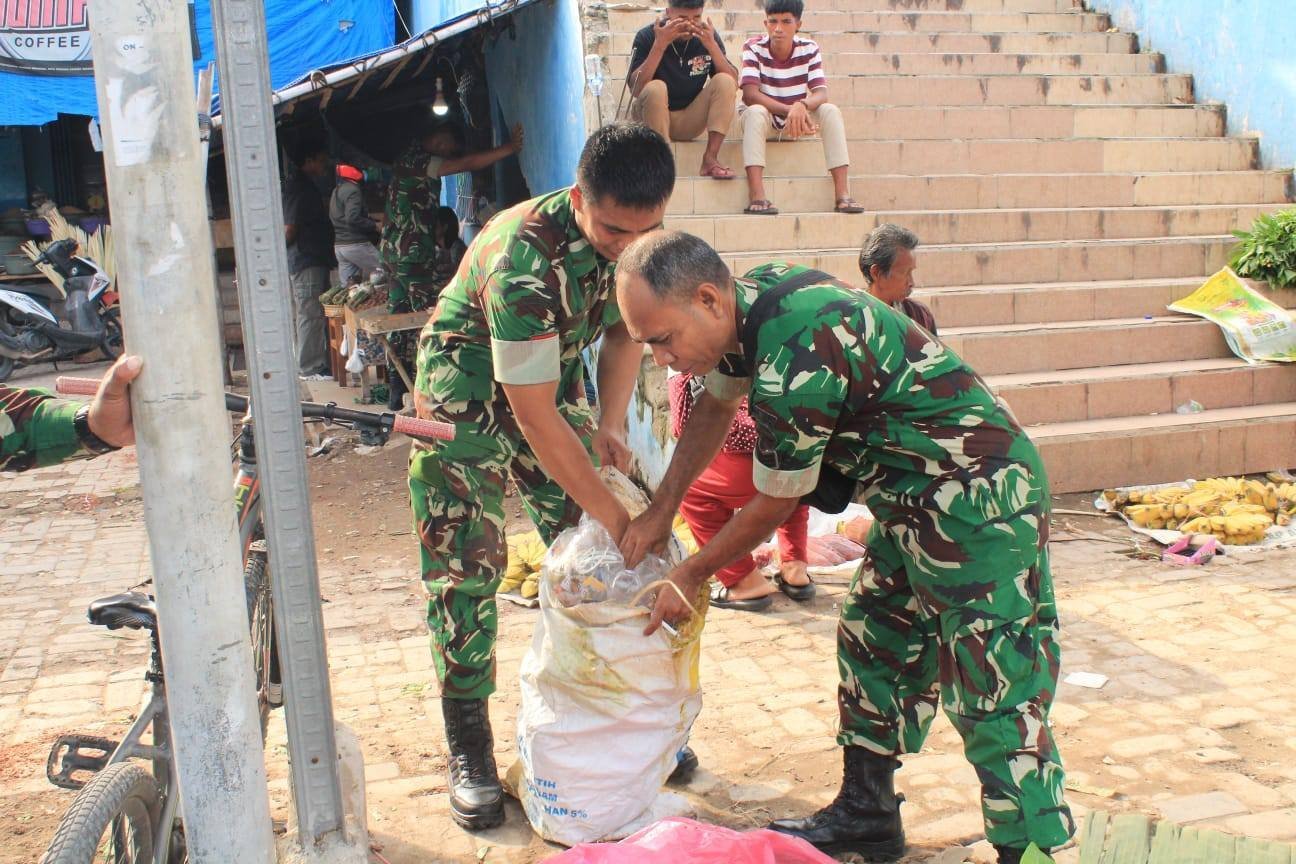 Anggota Kodim 1601/Sumba Timur, Koramil 05/Waingapu, Dinas Lingkungan Hidup Kabupaten Sumba Timur dan masyarakat setempat saling bergotong – royong membersihkan tumpukan sampah yang berada di area pasar.