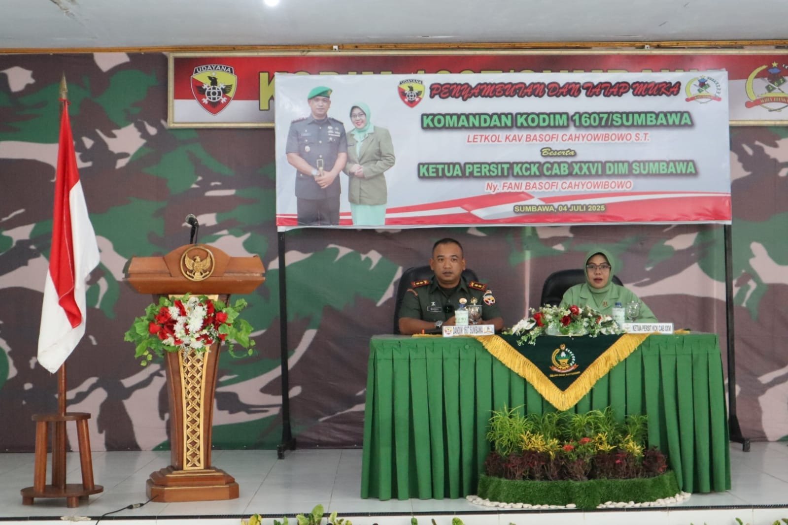 NTB — Sumbawa Besar, Suasana hangat penuh khidmat menyelimuti halaman Makodim 1607/Sumbawa saat seluruh jajaran Kodim menyambut kedatangan Komandan Kodim 1607/Sumbawa yang baru, Letkol Kav Basofi Cahyowibowo, S.T., bersama istri tercinta, Ny. Fani Basofi Cahyowibowo. Jumat (04/07/2025).