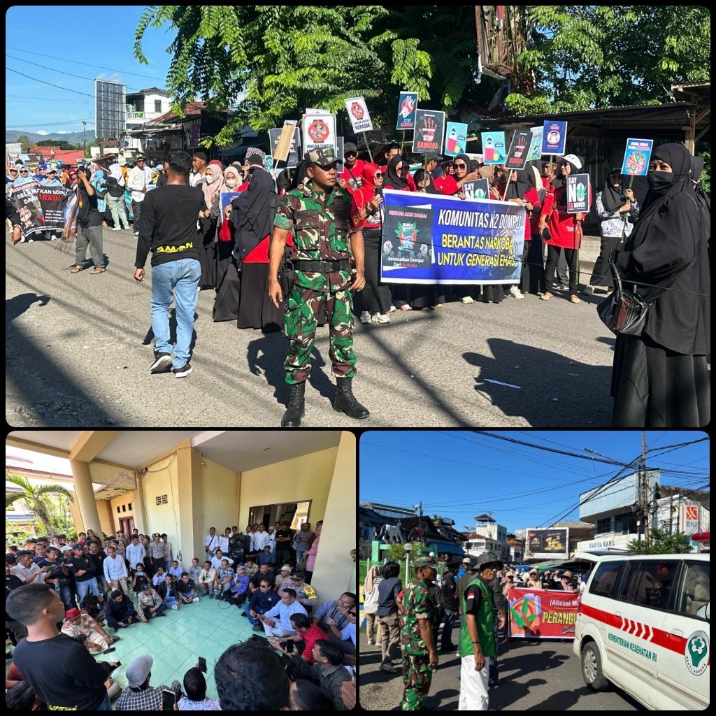 Dalam aksinya pendemo yang di koordum Rocky, S.Pd, Korlap 1 Beti Ayu Furqan, S.H, Korlap 2 Amirullah, S.H, Korlap 3 Abdurrahman (Aktivis KAMMI), dengan jumlah massa sekitar 5000 orang. dengan tuntutan diantaranya, Mendesak DPRD Dompu dan Pemerintah Agar Segera Menetapkan Kabupaten Dompu Sebagai Kabupaten Darurat Narkoba. Mendesak DPRD Dompu untuk mendorong Kapolri, Kapolda agar membentuk tim Independent pencari Fakta. Menuntut DPRD Kabupaten Dompu untuk mendesak Aparat Penegak Hukum Menangkap Pengedar (Bandar) Narkoba serta menindak tegas oknum APH yang di duga terlibat baik sebagai pengedar (Bandar) dan pembacking peredaran Narkoba diwilayah Kabupaten Dompu.