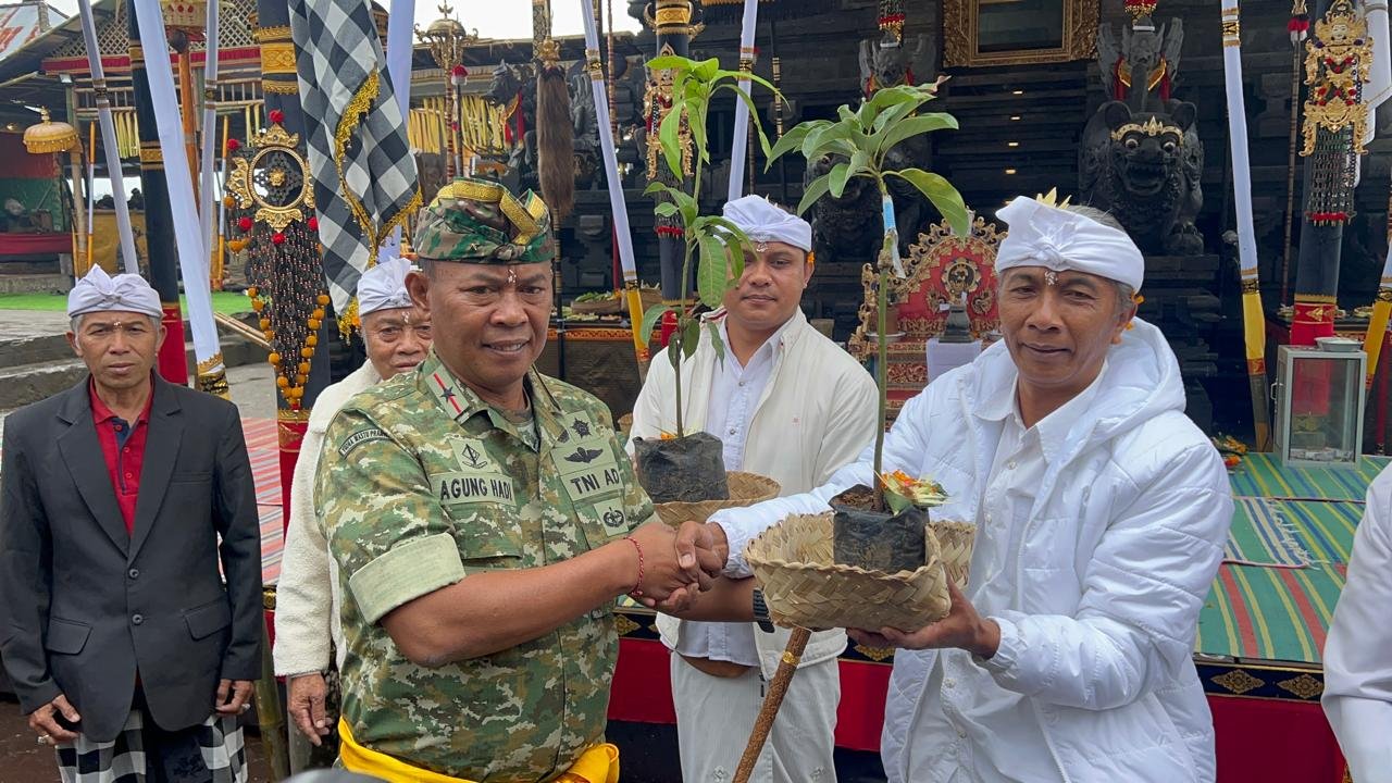 Bangli – Dalam rangka memperingati Rahina Piodalan Purnama Kesanga, Kodim 1626/Bangli mengadakan kegiatan Ngaturang Ayah di Pura Alas Harum, Desa Batur Selatan, Kecamatan Kintamani, Kabupaten Bangli pada Jumat, 27 Februari 2025. Kegiatan ini dihadiri oleh sejumlah pejabat penting, antara lain Danrem 163/Wira Satya Brigjen TNI Ida I Dewa Agung Hadisaputra S.H, Dandim 1626/Bangli Letkol Arm I Gede Arya Girinatha Utama, Kasdim 1626/Bangli Mayor Inf I Dewa Gede Yudawan, dan Danramil 1626-04/Kintamani Kapten Inf I Ketut Suparwan. Selain itu, hadir pula Ida Pemangku Desa Kintamani, para pejabat adat, dan masyarakat setempat yang berjumlah sekitar 250 orang.
