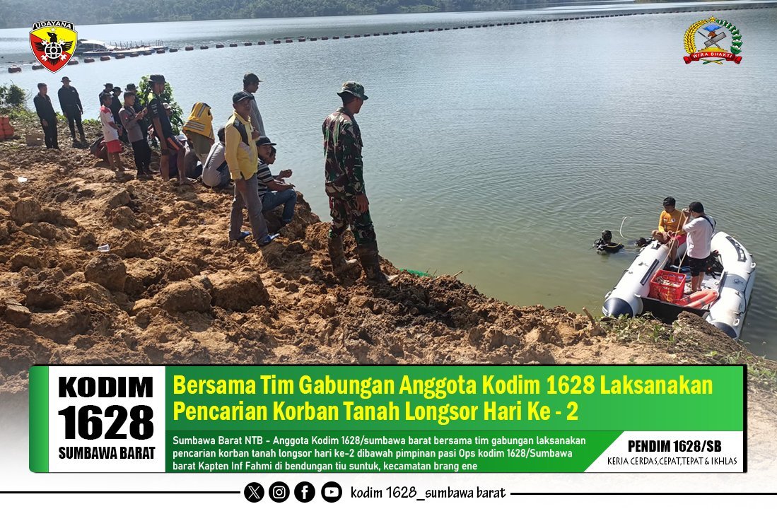Sumbawa Barat, NTB – Anggota Kodim 1628/Sumbawa Barat bersama tim gabungan melanjutkan pencarian korban tanah longsor di Bendungan Tiu Suntuk, Kecamatan Brang Ene, Kabupaten Sumbawa Barat, pada hari kedua operasi, Kamis (13/02/2025).