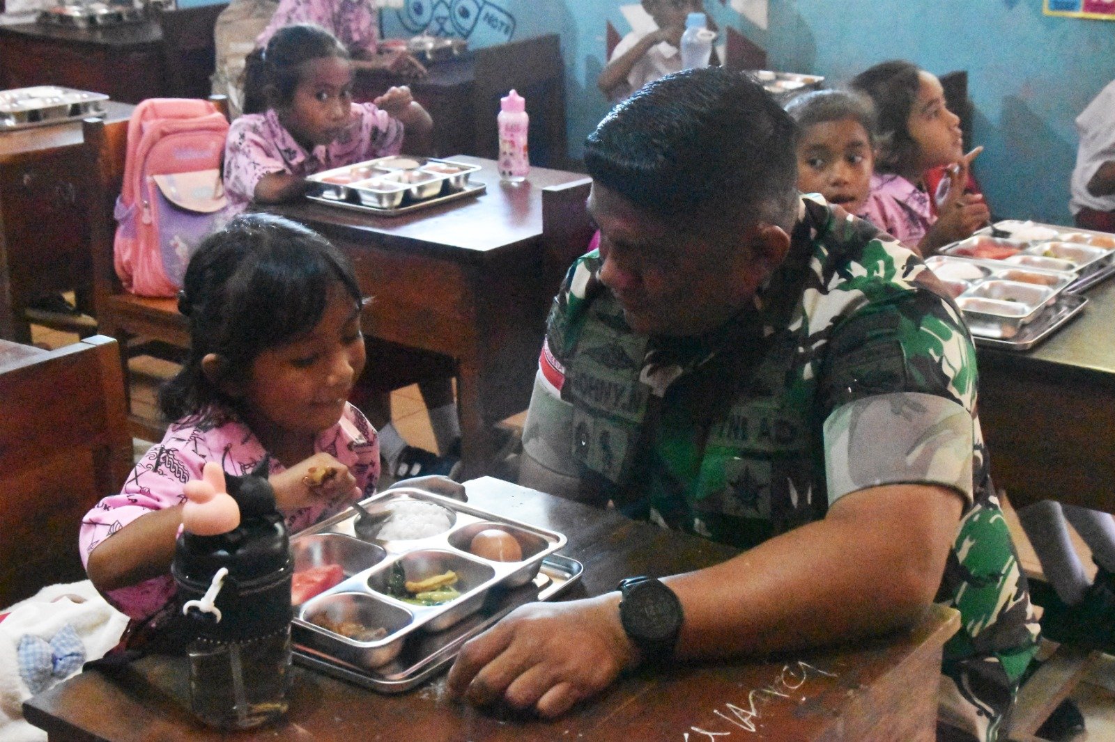 MERAUKE – 1707/Merauke Letkol Inf Johny Nofriady, S.E., M.Han mendampingi Badan Gizi Nasional (BGN) dalam melaksanakan makan bergizi gratis bagi 3.168 pelajar yang berasal dari tujuh sekolah yang berada di wilayah Kab. Merauke – Provinsi Papua Selatan.