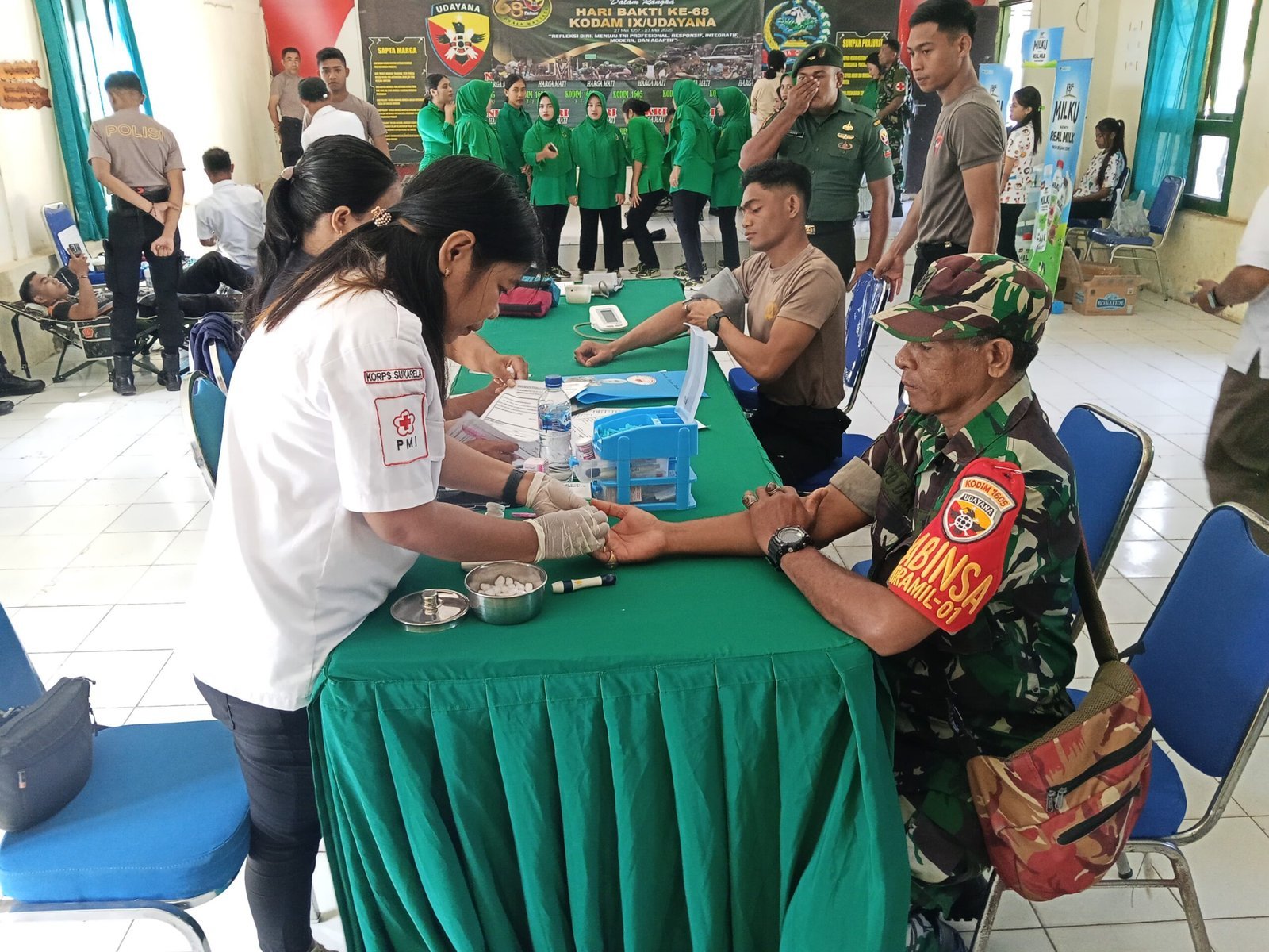 KODIM 1605/BELU, Dalam rangka memperingati Hari Bakti ke-68 Kodam IX/Udayana, Komando Distrik Militer 1605/Belu melaksanakan kegiatan bakti sosial kesehatan berupa donor darah yang diikuti oleh personel TNI di Belu, Polres Belu, Brimob Atambua, Persit Kartika Chandra Kirana.