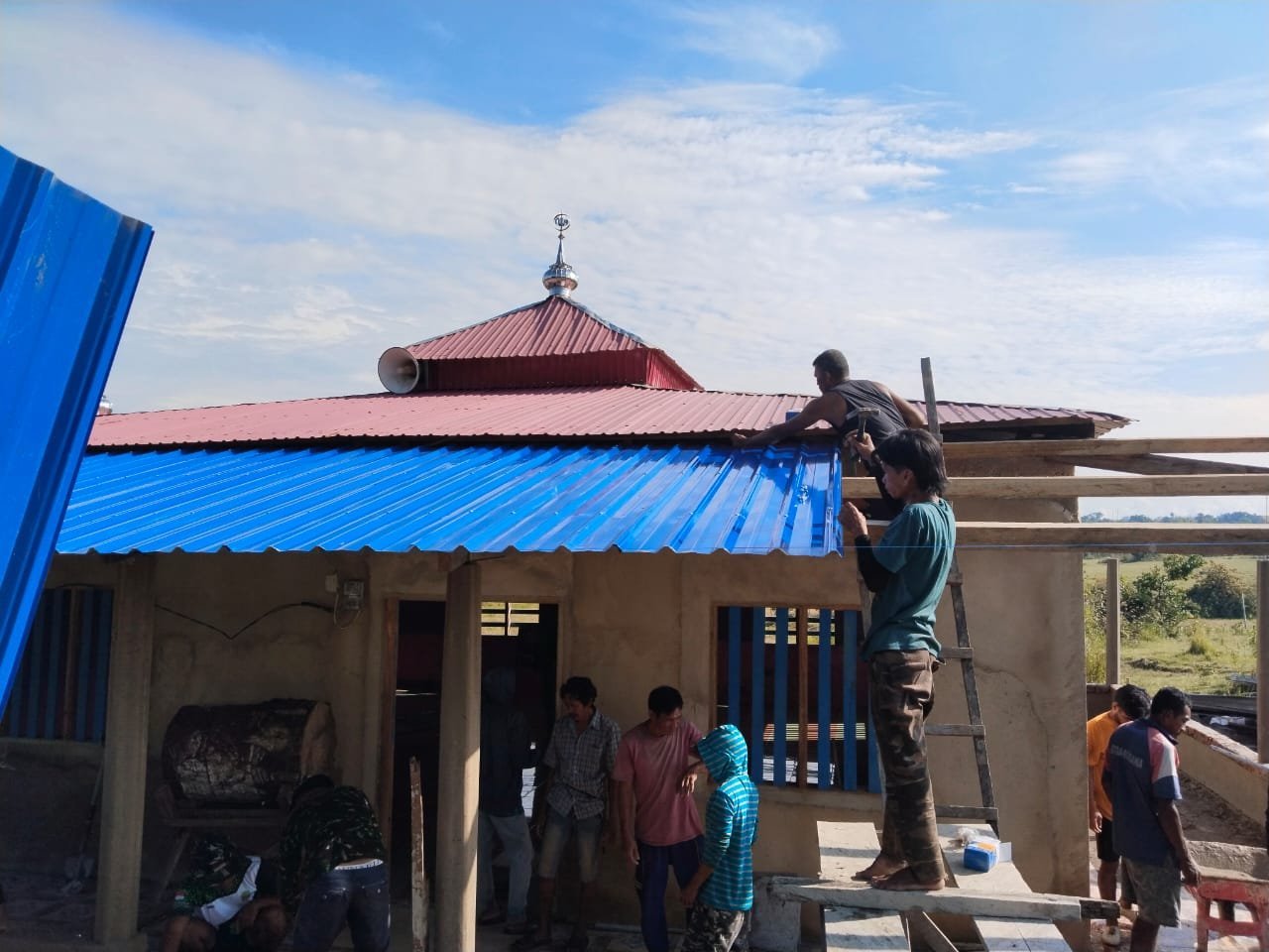 Kolaborasi Masyarakat dan Satgas TMMD ke-124, Bantu Pasang Atap Teras Masjid Al-Mukmin