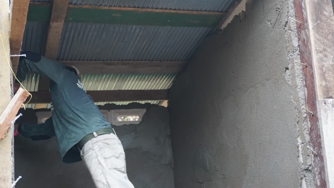 Di lokasi proyek, terlihat para anggota Satgas bekerja dengan cermat, menerapkan adukan semen pada permukaan dinding bangunan. Keberadaan dukungan dari masyarakat lokal menambah motivasi dan kekompakan dalam menyelesaikan proyek tersebut.