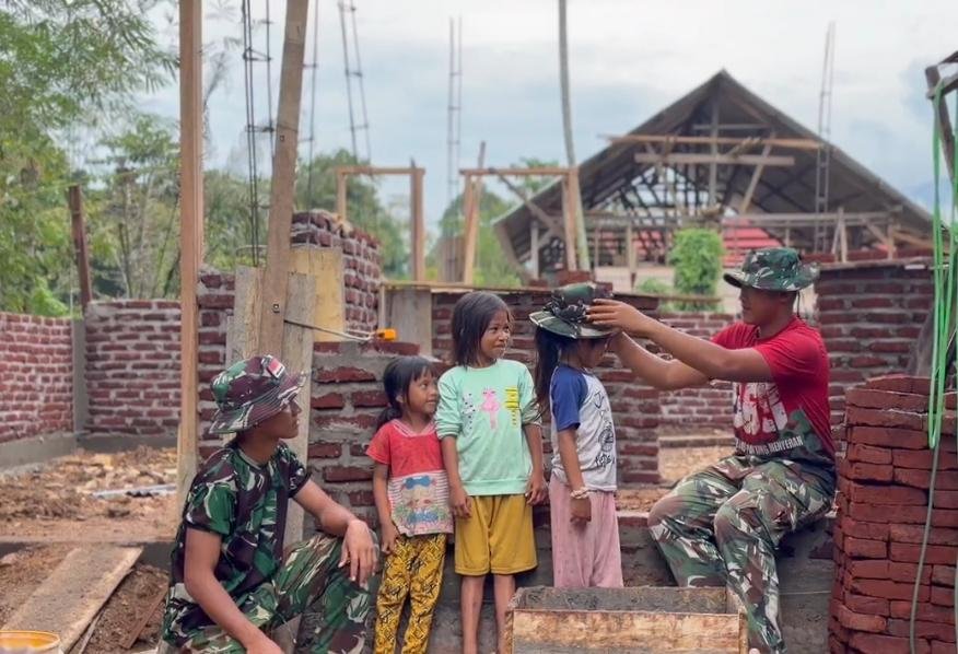 Dalam momen tersebut, terlihat beberapa personel TNI yang berinteraksi dengan ceria bersama anak-anak di sekitar area pembangunan. Dengan penuh perhatian dan sikap bersahabat, mereka menyapa dan menghibur anak-anak yang tampak malu. Sentuhan hangat dan ucapan selamat datang dari mereka menunjukkan bahwa keberadaan Satgas lebih dari sekadar tenaga kerja—mereka adalah bagian dari masyarakat yang saling mendukung.