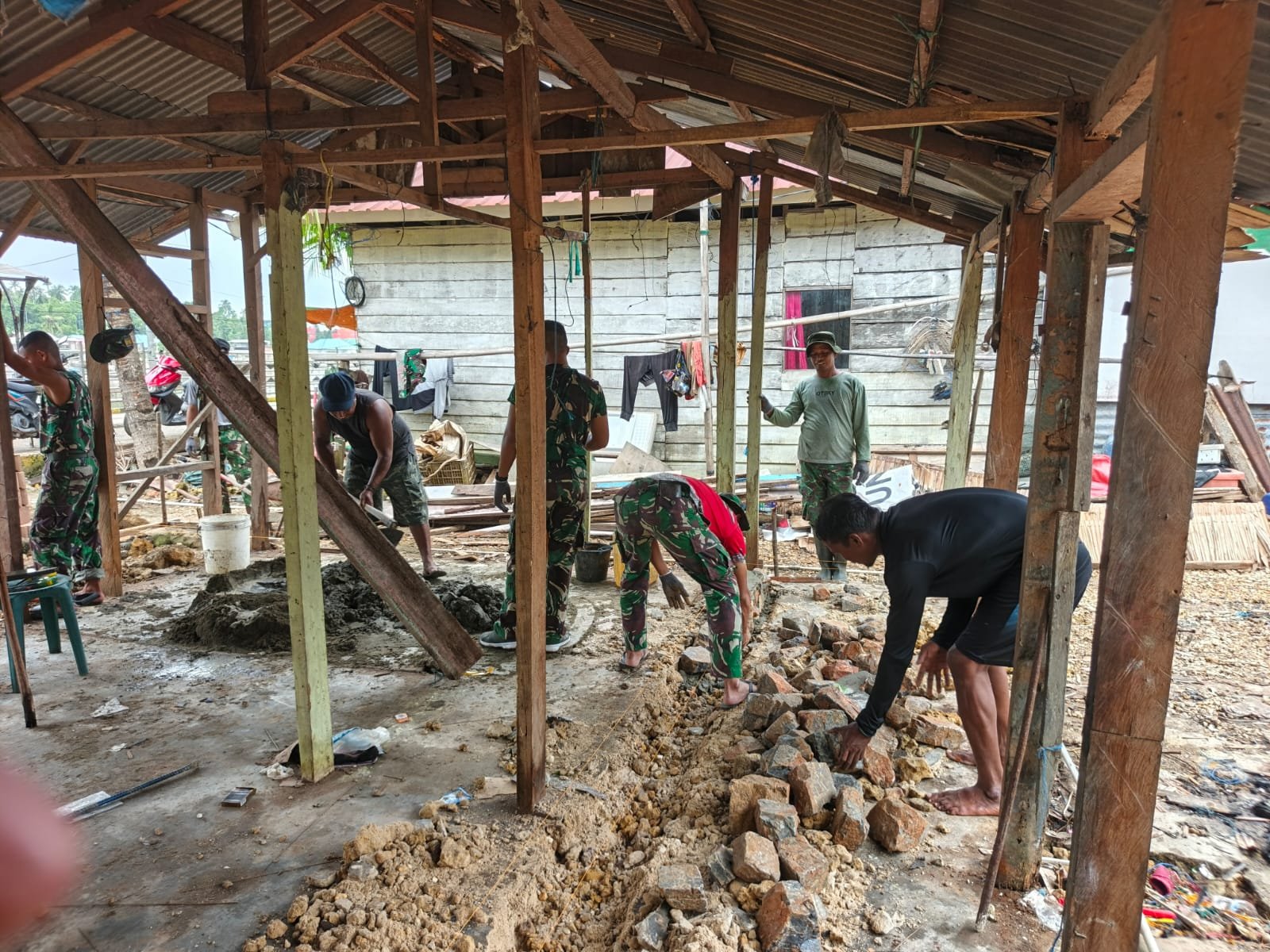 Kendari – Kerjasama antara TNI, Polri, dan Pemerintah Kelurahan terlihat jelas dalam pelaksanaan rehabilitasi Rumah Tidak Layak Huni (RTLH) pada kegiatan TNI Manunggal Membangun Desa (TMMD) ke-127 yang dilaksanakan oleh Kodim 1417/Kendari. Pada hari Kamis, 12 Februari, Babinsa, Bhabinkamtibmas, dan Lurah Petoaha melakukan peninjauan langsung terhadap proses pembangunan di Kelurahan Petoaha, Kecamatan Nambo.