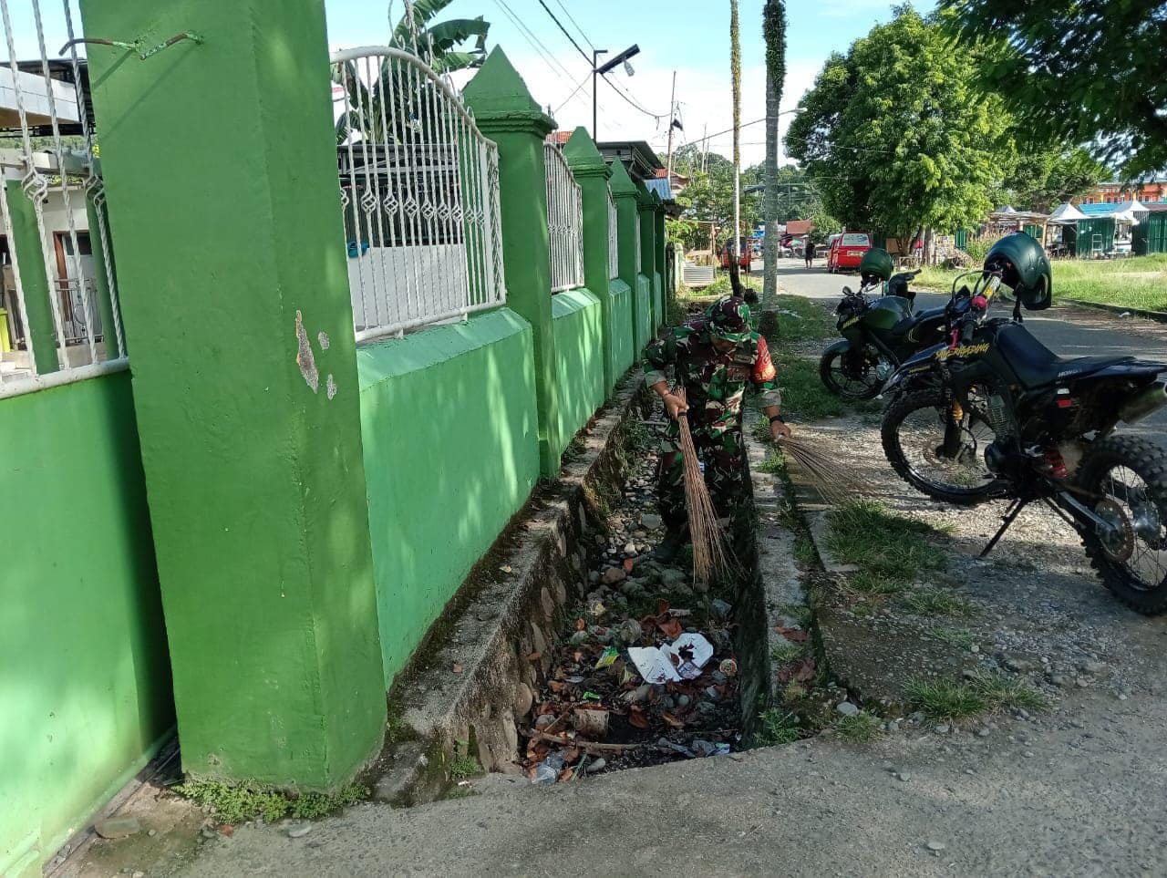 Terlihat Personel Koramil 1403-07/Walenrang Membersihkan Saluran Air di Kawasan Masjid Nurul Tarbiyah