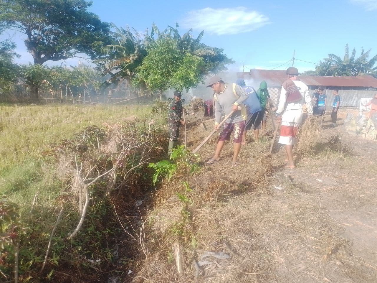 Pembersihan dilakukan di beberapa titik yang menjadi fokus utama, termasuk rumput liar yang mengganggu aliran air. Dengan menggunakan sekop hingga Parang, para anggota Koramil bersama warga bahu-membahu membersihkan area tersebut.