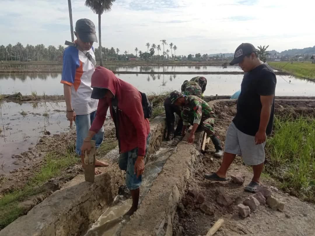 Proses perbaikan saluran irigasi dilakukan secara gotong royong antara personel Koramil 1420-01/Panca Lautang dan warga sekitar. Dengan penuh semangat kebersamaan, mereka bekerja memperbaiki dinding saluran yang rusak, membersihkan endapan lumpur, serta memperlancar aliran air yang sebelumnya terhambat.