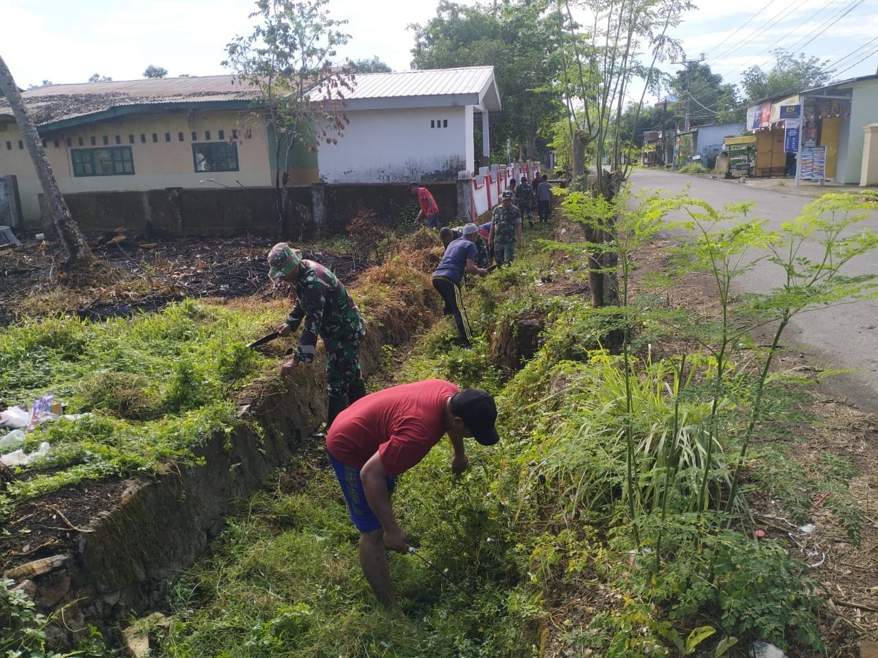Anggota Koramil 06/Mapsu bersama warga tampak kompak bahu-membahu membersihkan saluran air yang tertutup oleh sampah dan lumpur serta semak belukar sehingga menggangu aliran air tidak lancar.