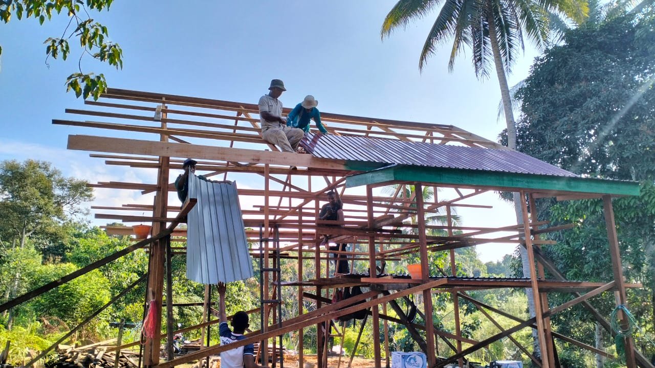 Saat ini, rumah berbahan kayu milik Bapak Rahman telah memasuki fase krusial, yaitu pemasangan atap seng dan resplang. Pengerjaan ini dilakukan secara manual dengan menggunakan peralatan sederhana, namun dengan ketelitian dan kecermatan yang tinggi.